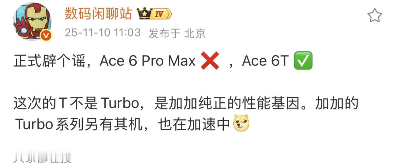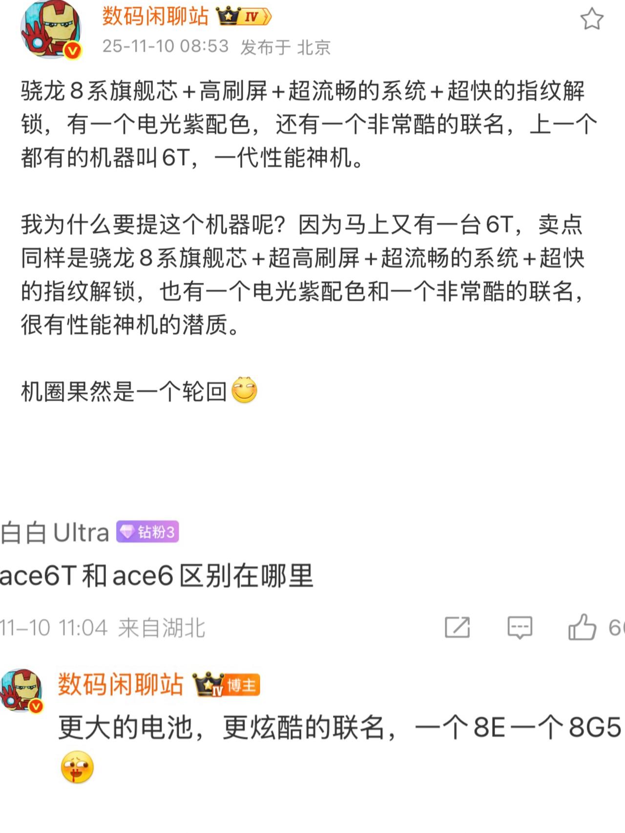 爷青回!数码闲聊站辟谣了 一加没有PM,而是Ace6T 之前网友说的什么拍到了一加Ace6 ProMax是假的[捂脸]或者说是一加又改名回来了,不打算跟Pro Max的风了,而之前大氢还在时期,同样有骁龙8系旗舰芯片,同样名为6T的机子,性能悍匪,真就爷青回! 当然了,各位也别担心说啥大屏没了,一加Ace6T还是大电池+大屏,设计方面有个跟当年一样的紫色工艺,站哥说是很骚的电光紫[灵光一闪] 而配置方面也不用说啥T是Turbo了,一加就没有这个系列,T就是正代旗舰系列。骁龙8Gen5+LPDDR5X Ultra+UFS4.1满配三件套,跑分比骁龙8Elite高,目前实测比8Elite机型强,完事儿电池还是8000mAh+,配备了超声波指纹以及165Hz超高刷屏幕 我只能说游戏党有福了,超大屏+超大电池+165Hz,打游戏那叫一个爽!