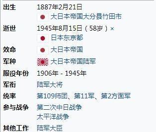 1945年,日军乙级战犯阿南惟几拒绝投降,在家中剖腹自尽,令人意外的是,自己动手两次都没成功,最后还是小舅子好心送了他一程。 阿南惟几1887年2月21日生于大分县竹田市,父亲是内务省高官。他早年接受军事教育,1900年9月从广岛陆军幼年学校毕业,1905年11月完成陆军士官学校第18期训练,次年6月晋升少尉,分配到步兵第1联队。1908年12月升中尉,1910年11月任陆军中央幼年学校生徒监。1916年11月晋升大尉,1918年11月从陆军大学校第30期毕业。1919年4月进入参谋本部附勤务,同年12月成参谋本部员。1922年2月升少佐,1923年8月任萨哈林州派遣军参谋。1925年8月晋升中佐,同年8月到12月作为武官派往法国。1926年4月任军令部参谋,1927年8月再赴法国,同年12月回国任步 1930年8月1日,阿南惟几升大佐,1933年8月1日指挥近卫步兵第2联队。1934年8月1日任东京陆军幼年学校长,1935年3月15日晋升少将。1936年8月1日任陆军省兵务局长,1937年3月1日转人事局长。1938年3月1日升中将,同年11月9日指挥第109师团,在华北作战。1939年9月12日入参谋本部附,10月14日任陆军次官。1941年4月10日指挥第11军,参与第二次长沙会战,从汉口出发进攻长沙,但日军遭中国军队顽强抵抗,损失惨重,会战以失败结束。同年9月到10月,他再次指挥第三次长沙会战,集结12万兵力进攻,但中国第九战区薛岳部队设下口袋阵,日军陷入包围,伤亡过半,又一次败退。这两次会战暴露了日军在华作战的困境,阿南惟几的指挥未能扭转局面。 1942年7月1日,阿南惟几任第2方面军司令官,驻守满洲。1943年5月1日晋升大将,同年10月,他的部队调往新几内亚,但战绩不佳。1944年12月26日回东京,任航空总监兼航空本部长,同时兼军事参议官。此时盟军已占领莱特岛,从民都洛岛推进控制菲律宾,日军大本营计划让他统一指挥澳大利亚北部、婆罗洲和菲律宾南部的作战,但战局恶化,他参与推动空中特攻战术,尽管内部有批评声音,认为这种自杀攻击浪费人力。他在日记中记录了对陆军大臣职位的犹豫,但最终在1945年4月7日铃木贯太郎内阁中担任陆军大臣,直至8月14日。在太平洋战争后期,他作为主战派,推动战争延续到本土决战,但天皇决定接受波茨坦宣言后,他协助维持天皇意志,阻止陆军内部反对投降的混乱。 1945年7月26日,美英中三国发表波茨坦宣言,要求日本无条件投降。日本政府27日收到后,在东京召开最高战争指导委员会和内阁会议讨论。阿南惟几坚持政府宣布断然抵抗,避免国民动摇,与外务大臣东乡茂德意见对立,后者认为不必拒绝以留和谈空间。会议后,日本暂不公布政策,仅允许报纸报道宣言并评论。内阁签署结束战争诏书后,阿南惟几会见东乡茂德,道歉并感谢外务省向盟国表达关于占领和军队解除武装的愿望。8月14日,天皇决定投降后,阿南惟几在陆军部表示必须服从天皇命令,在场高级将领在一份服从投降约定的文件上签字,同日他与其他内阁成员在投降文件上签字。14日夜晚11时后,他回陆军大臣官邸,写下给铃木首相的辞任辞呈。15日清晨5时30分,留下给天皇的遗书后,在官邸切腹自杀。他让妻弟竹下正彦守庭院门口,不准人入。他切开腹部,又刺脖子,但两次未致命。竹下正彦进入,用枪射击其头部结束生命。这是日本内阁制度以来,现任大臣首次自杀。 尽管陆军内部反对投降,8月14日晚一些军官发起宫城事件,试图控制皇宫阻止投降广播,但事件迅速被平息。1945年8月15日中午,天皇投降谈话录音顺利广播,宣布接受波茨坦宣言结束战争。阿南惟几的自杀发生在广播前,他的遗体在官邸被发现,军方处理后运出。他于当日死亡,终年58岁。他的剑、染血军装和遗书保存在靖国神社旁博物馆。他的儿子阿南惟茂2001年至2006年任日本驻华大使。阿南惟几在战争结束中发挥作用,尽管推动延续作战,但最终服从天皇,避免更大混乱。