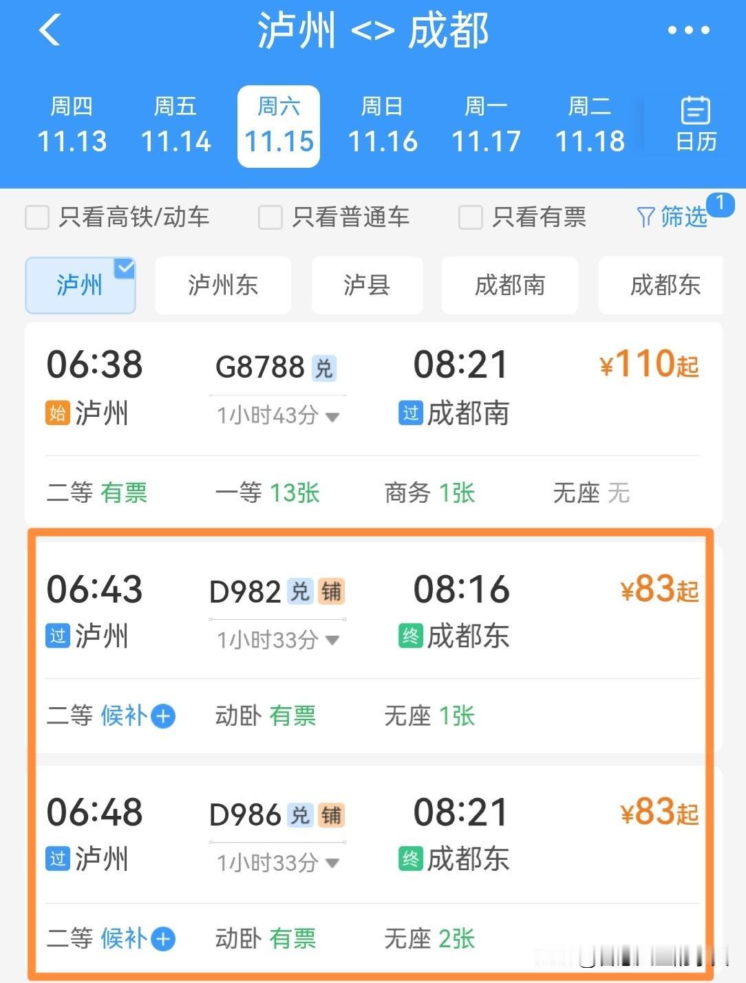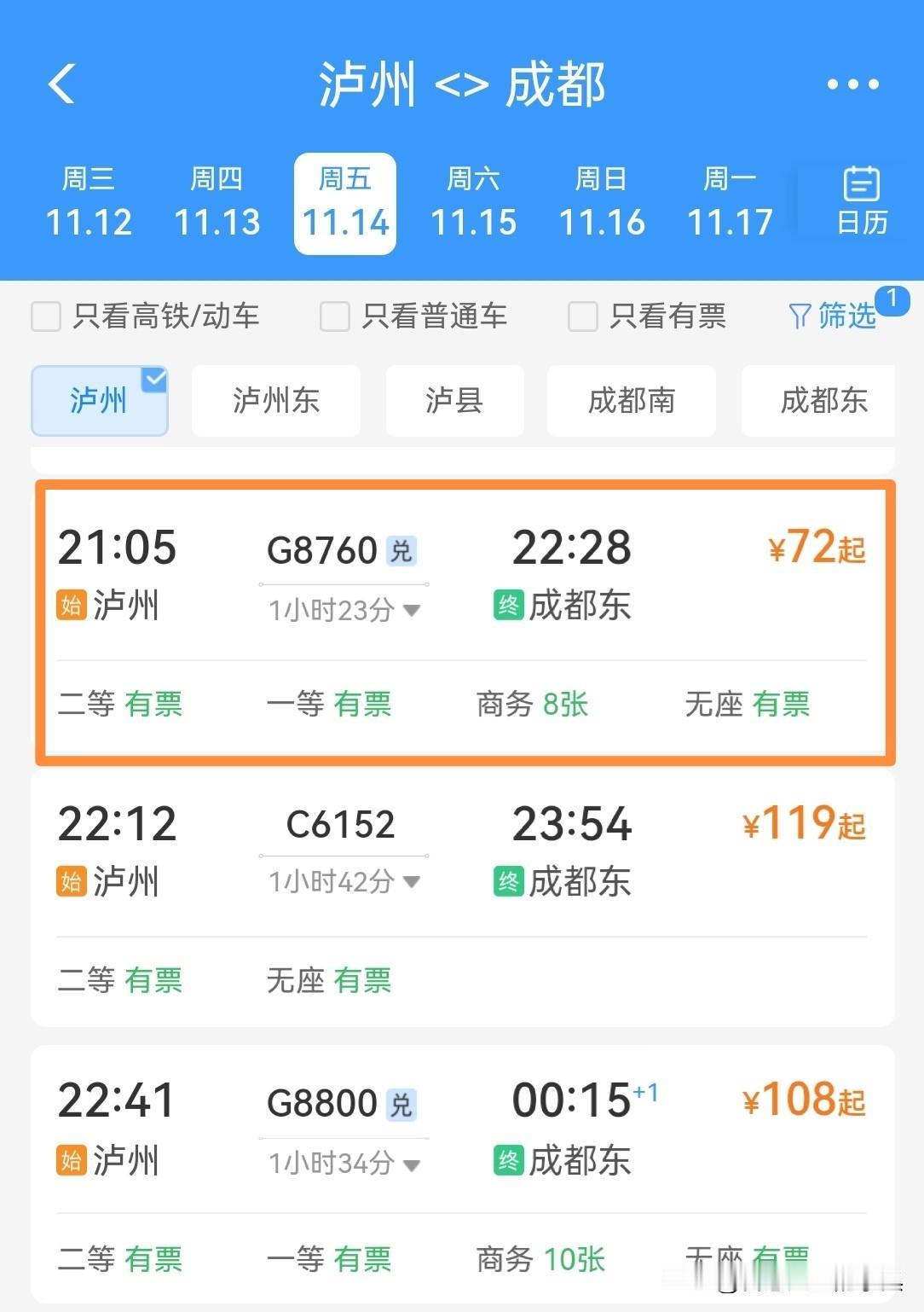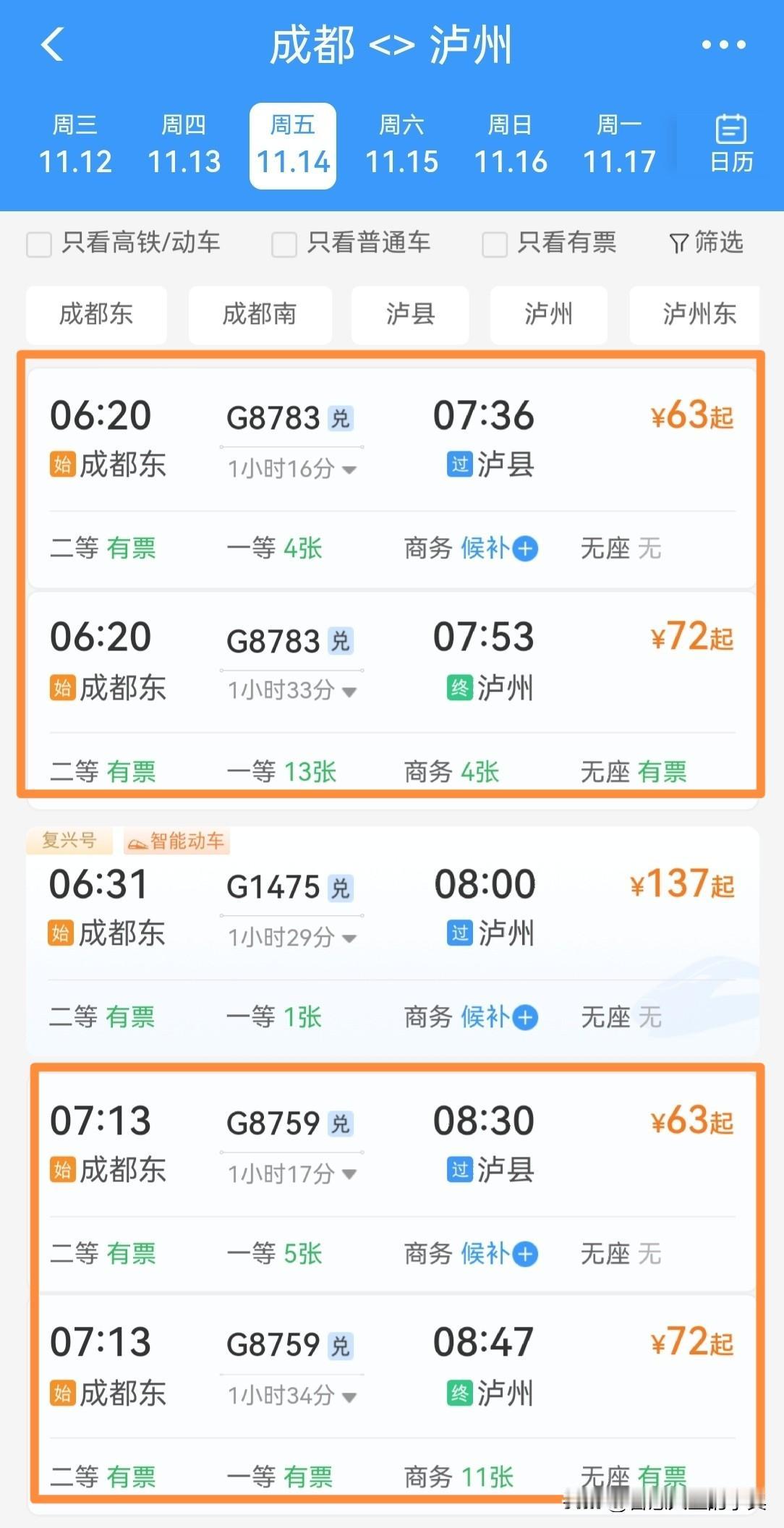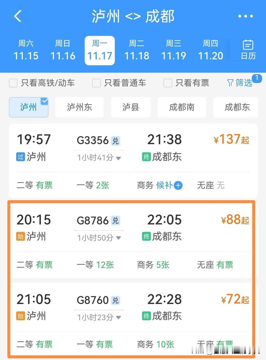 继续自贡与成都之间高铁动车票指定车次车票大幅度折扣以后,泸州与成都之间的高铁动车车票也推出惊喜票价。 在两地之间的早晚指定车次票价在60多元至80多元之间,这个票价的确足以吸引人。不过唯一的问题就是要么就是很早,要么就是较晚。如果不是急着出门的话,估计大部分人都想多睡会儿懒觉。 不过话又说回来,这种充分发挥公共资源利用最大化的政策是值得点赞的。既满足了部分群体省钱的预期,同时也提升了动车上座率。所以这种政策可以进一步更广泛的推广。