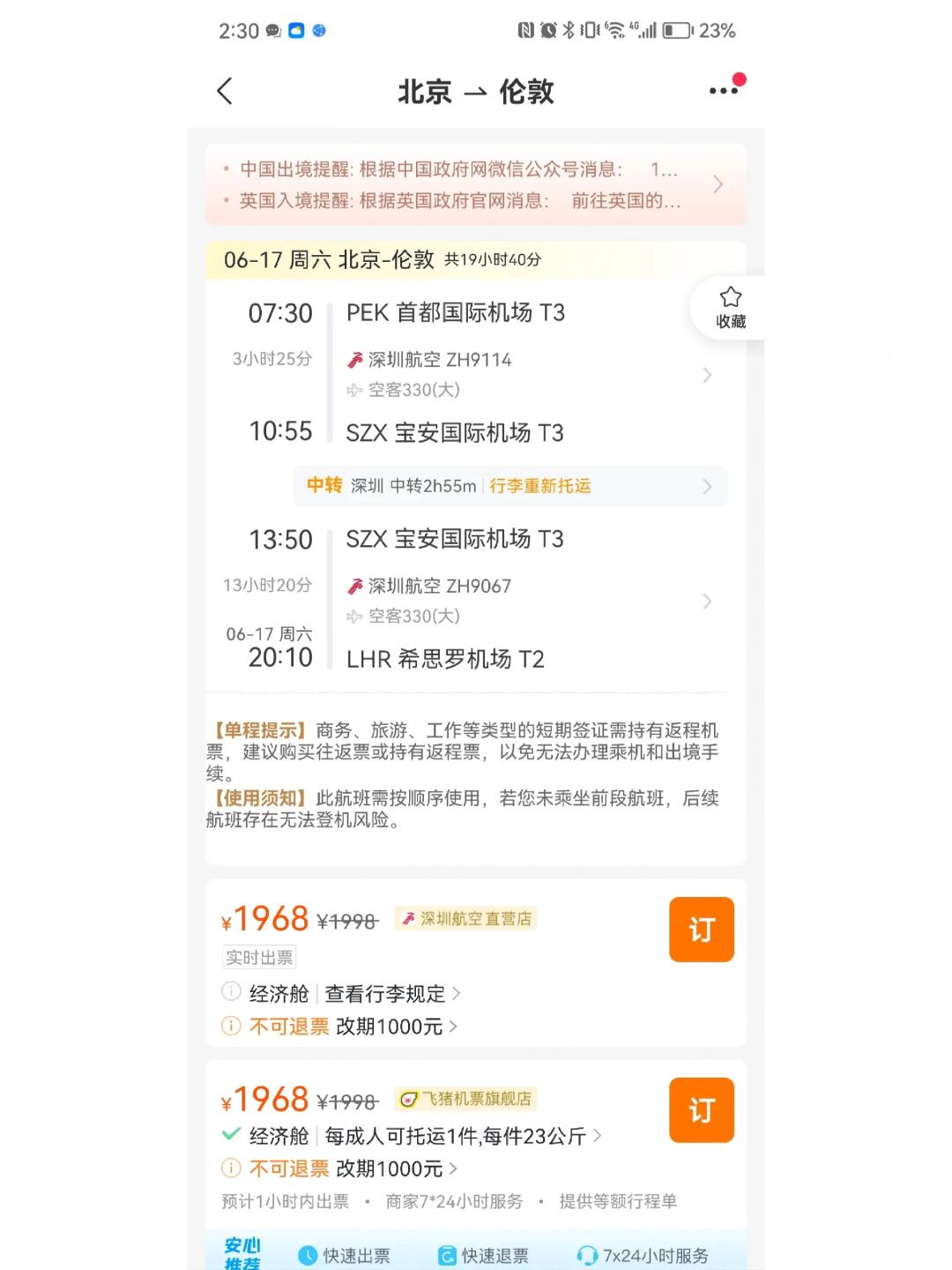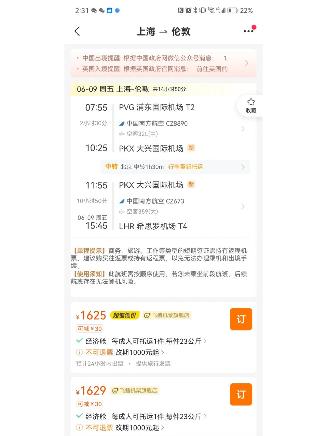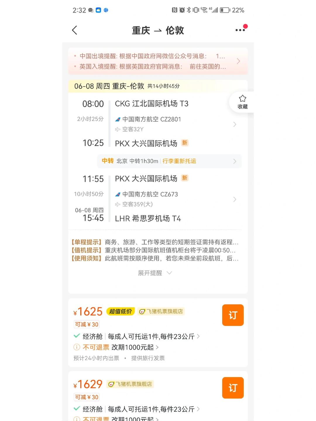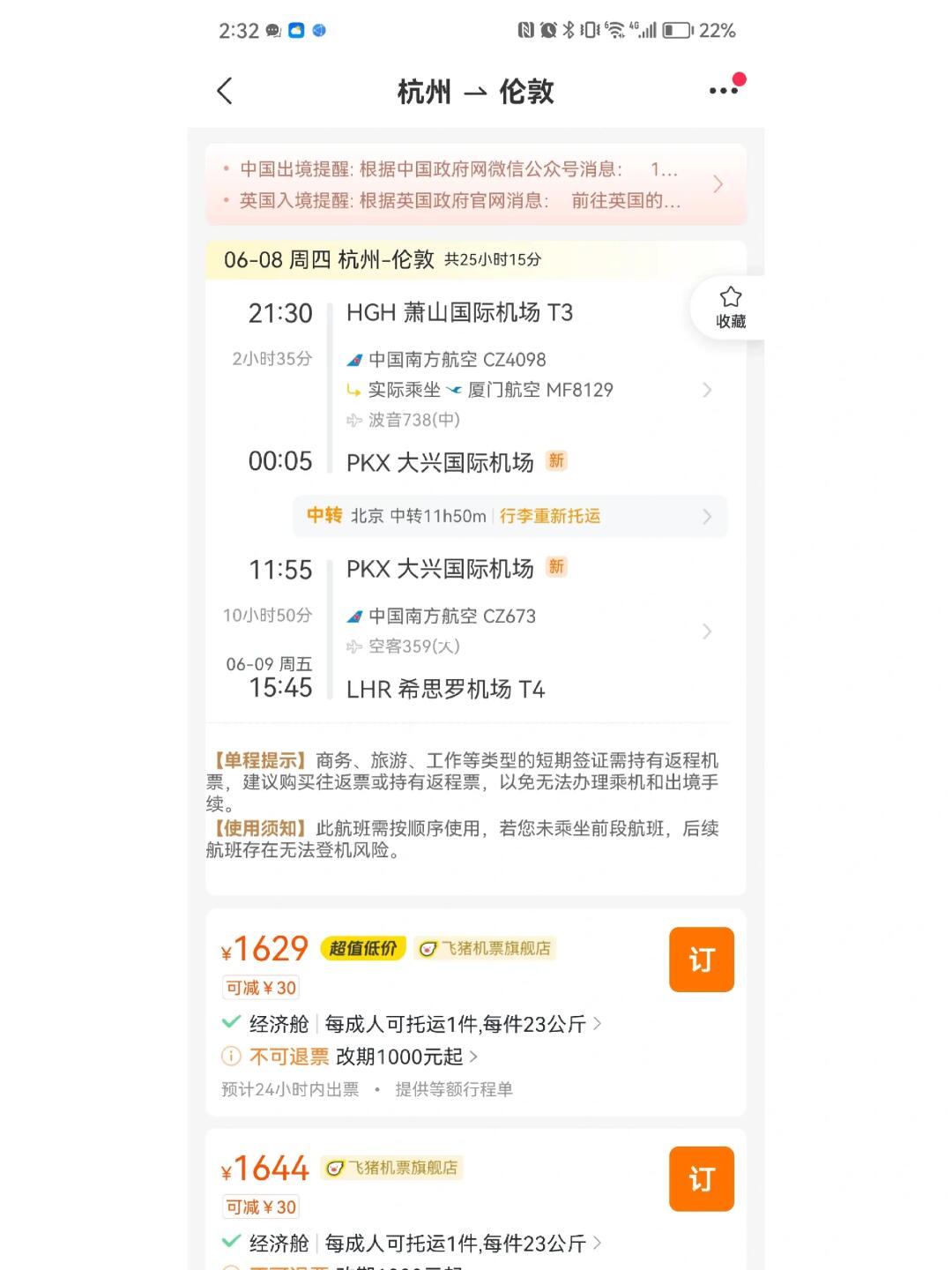 关注我,随时给你推送特价机票! 特价机票又来了 全国各地经北京中转含税只要1600多 ❤️某些平台有券,使用后不到1600 大家注意各个地方均有均有两个航班中转北京,其中之一转机需要1.5小时,这个时间比较赶,而且北京大兴机场国际转机通道还没有回复+行李需要重新托运! 除非不托运,建议大家选择中转10多个小时那班! 还有个提醒大家多看看日期,包括预约英国签证的时间!确保签证能赶上出行日期