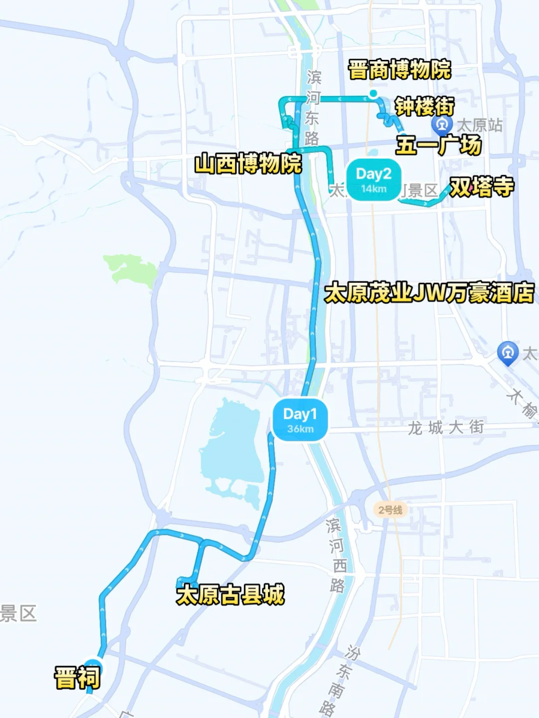 太原站➡️太原JW万豪酒店➡️晋祠➡️太原古县城➡️钟楼街➡️五一广场