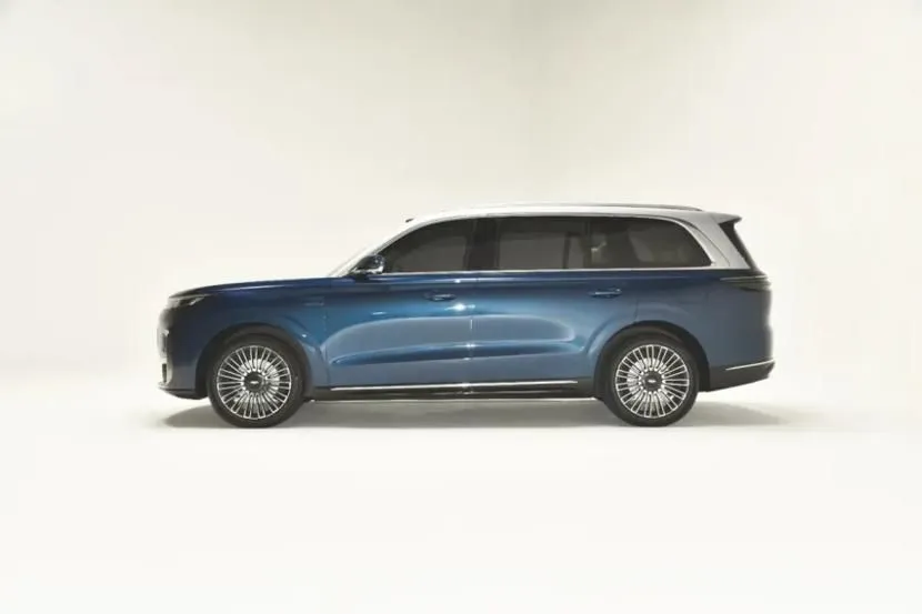 来到侧面,这款车又很像目前风头正劲的一款新车,那就是问界M9。都是蓝白双色车身,都是21英寸银色密辐式轮毂,就连轮毂的造型设计都非常类似,当然了你也可以说,它们两都是致敬的奔驰GLS。但是同样是致敬,这风云T11和问界M9的侧面相似度,可是要比问界M9和迈巴赫GLS的相似度高很多。