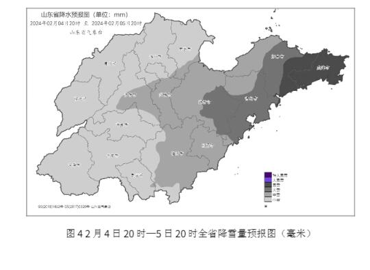 山东省气象台于2月4日16时00分继续发布暴雪蓝色预警和道路结冰橙色预警:目前,鲁南地区已出现小到中雪。预计4日夜间—5日白天,潍坊南部、青岛、烟台南部和威海有大雪局部暴雪,降雪量5~10毫米,积雪深度4~10厘米;济宁、枣庄、临沂、日照、济南、淄博、泰安、潍坊北部和烟台北部有中雪局部大雪,降雪量3~5毫米,积雪深度2~5厘米;其他地区有小雪。降雪明显地区将出现对交通有较大影响的积雪和道路结冰。请加强防范。