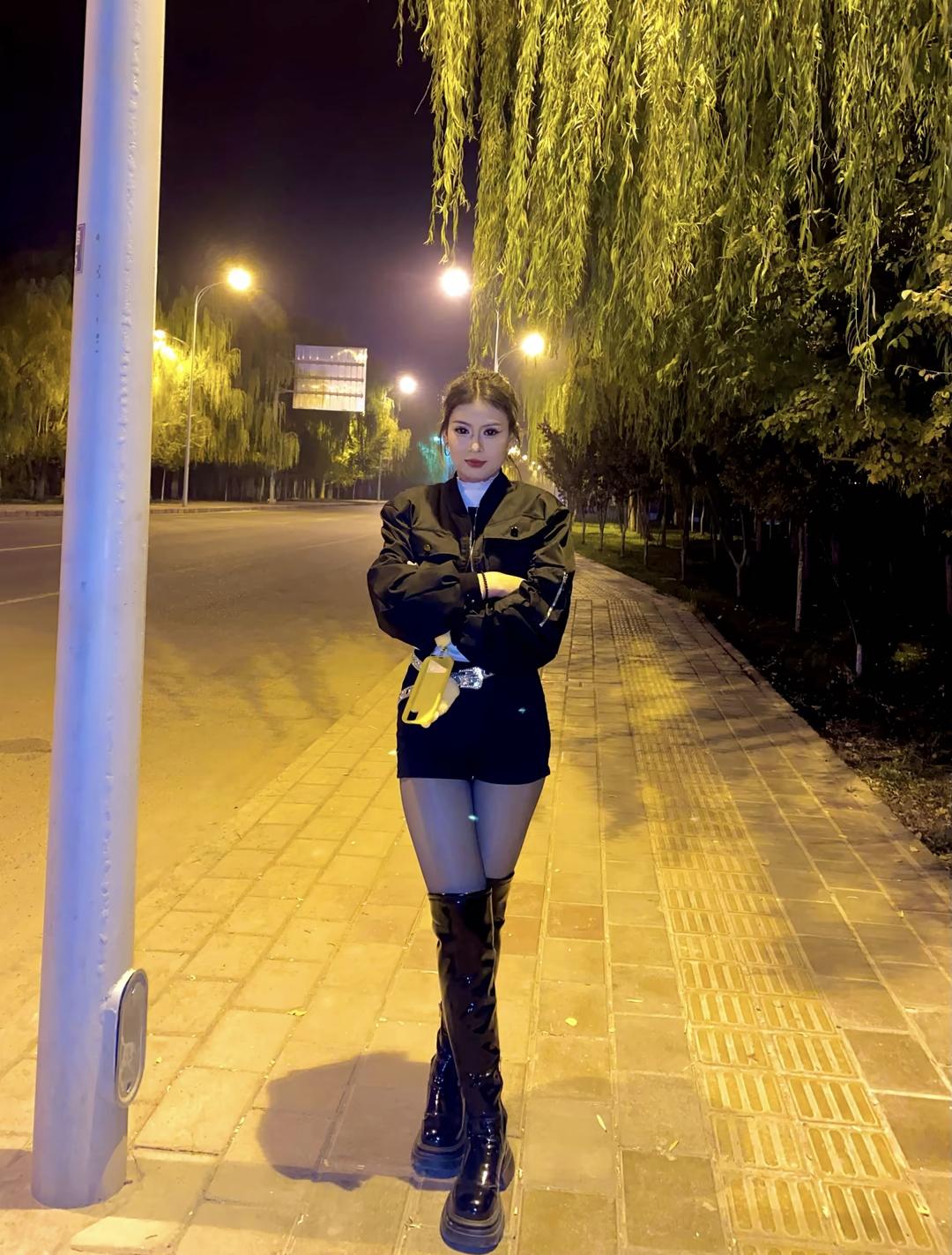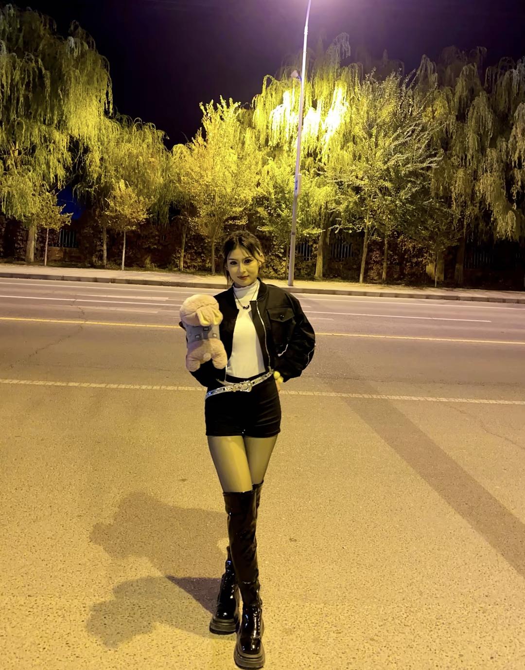 夜晚街拍,酷炫皮衣搭配,时尚潮流,手拿毛绒玩具,自信满满!💃🏻👗👠