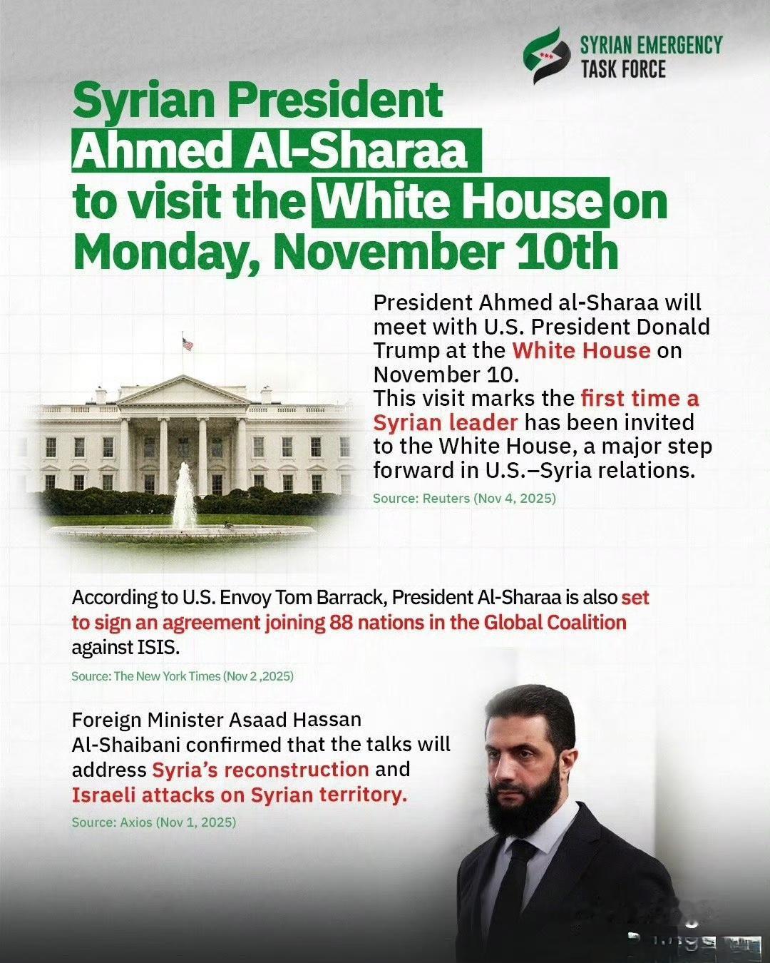 叙利亚总统沙拉(朱拉尼)已经到达美国,受到热烈欢迎,白宫外一群叙利亚裔聚集庆祝。截止目前,沙拉已经与美国国会外交委、国际货币基金组织、中央司令部会谈完成,马上准备会见特朗普。 叙利亚预计会加入由美国主导的反ISIS联盟。朱拉尼出身基地组织,反ISIS,很合理。 顺便辟个谣: 第一,中国从来没有在安理会否决过涉及沙拉(朱拉尼)的议案。 第二,十二年前将朱拉尼列入恐怖分子名单的联合国议案,是英美两国联手提交的,安理会一致表决通过。前几天移出名单的议案,是美国单独提交的,中国弃权。