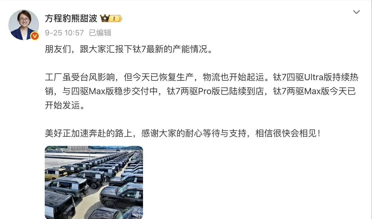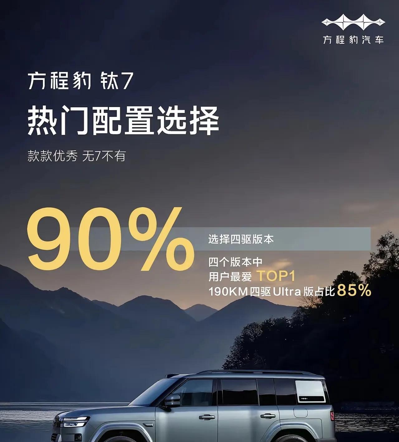 方程豹钛7为啥就火了,10月销量超2万,11月可能超3万,配置给的太多了 无心插柳柳成荫,这不就是说的方程豹钛7吗,所有人都没想到,方程豹钛7作为一款方盒子的个性化SUV,怎么就火了?难道这车有什么魔力吗? 钛7销量一爆发,直接把方程豹其他的车型也带动了起来,这下,方程豹只剩下订单未交付的焦虑了,没有品牌焦虑了。 我觉得下半年推出的钛7,比亚迪是吸取了教训的,什么意思了,就是大力出奇迹,直接把价格焊死,不是说不能打价格战吗,那就直接掀桌子吧,一步到位,所有配置都给的高高的,但价格一看,最高才21.98万。 其实要说方程豹钛7,真正了解比亚迪的,基本上都会发现,这车有唐的一些影子,比亚迪今年的唐L系列销量不是特别好,然后就换个壳,好了,成了钛7。 然后再加上些配置,在修改一下配色,在听劝网友们的意见,要大5座,要长续航,都给了,换句话说,钛7就是比亚迪唐的听劝版。 看看钛7的4个版本,到底该怎么选,实际上,最高配才是值得选的,方程豹也给出了销量数据占比,选择四驱版的占比超过了90%,选择最高配的占比超过了85%,已经说明了问题,大家对于最高配的价格也没有觉得贵,而且给到了很多的实用配置,比如抬头显示,还有激光雷达版的天神之眼B。 另外,这款车一出,直接把比亚迪的月销量给稳住了,相当于算是补强了唐系列的销量,也间接的提升了方程豹品牌的销量,让方程豹成为top3突破20万销量大关的新势力品牌。 实话讲,这车的内饰是真的好看,而且可玩性也多,我就在想,比亚迪是不是换了内饰负责人,把内饰交给了年轻人设计,还有比亚迪的平板,内饰科技感也有了,外观也有了,技术也有了,销量就有了。 而现在,方程豹的订单量还有8万多台没有交付,没办法,实在是生产不过来了,钛7现在一个月产能满打满算也就3万出头,估计还没有,后续订单量还在持续增加,估计等车要等一个多月才行了。 这在比亚迪的车型中,已经很久没有出现过这种情况了,这也算是好事了。 不过,好饭不怕晚,对于定了钛7的,还是慢慢等吧,毕竟这款车,官方是真的没想到会有这么高的销量,真的是属于无心插柳柳成荫了。 这车目前来讲,还没有什么竞品,友商估计还在研发当中,但比亚迪现在有产业链优势,还有供应链优势,价格和配置还有质量都有保障。 所以还是那句话,当比亚迪开始堆技术后,然后把外观设计改变后,销量是真的不愁了。 比亚迪今年已经有两款现象级的车型了,另外一款海狮06也是一样,在15万的价格区间,月销量接近4万辆了,相当于说,比亚迪在10-20万的SUV中,已经有定价权了。 今年马上年底了,方程豹钛7产能起来后,我觉得月销量突破3万辆是完全没有问题的,另外再说一句,选择四驱版本是最划算的哦。