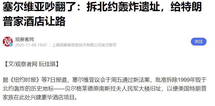 塞尔维亚将拆除北约轰炸遗址,为特朗普酒店让路 11月7号这天,塞尔维亚议会突然抛出个炸弹,靠着执政党推动的特别法案,硬生生以多数票通过了拆除决议,就为了给特朗普家族的豪华酒店腾地方。 消息一出来,塞尔维亚国内直接炸了锅。反对党议员在议会大厅里拍着桌子骂街,说这根本不是什么城市改造,而是“对历史的二次犯罪”,是武契奇政府为了讨好美国,把民族尊严当商品卖。 文物保护者们拉着“留住伤痕”的横幅围在遗址外,不少经历过轰炸的老人举着当年的照片流泪,他们说这栋楼里埋着三十多个牺牲的士兵,拆了它就是忘了本。连国家检察官都站出来发声,质疑议会用特别条款绕过文物保护法的做法违宪,要求暂停决议执行。 面对铺天盖地的骂声,武契奇在电视讲话里的样子格外疲惫。他先撇清了关系,说这个项目是政府和特朗普的女婿库什纳谈的,总统办公室没直接参与,可话锋一转又没法不承认,“这是权衡再三后的无奈选择”。 他还试着给民众画了个饼,说库什纳答应了,酒店里会建个小型纪念馆,让后人还记得这段历史。可这种说辞根本没人买账,有网友直接怼回去:“把纪念碑盖在酒店里,是让住店的富豪们饭前饭后参观一下‘屈辱展览’吗?” 这话听着刺耳,但武契奇的难处,外人其实很难真的体会。塞尔维亚这个国家,这些年一直夹在美国、俄罗斯和欧盟之间走钢丝,早就被磨得没多少选择权了。 最先让武契奇扛不住的,是美国那35%的关税大棒。今年8月特朗普一声令下,就给塞尔维亚的进口产品加了重税,首当其冲的就是汽车零部件和食品行业——这俩是塞尔维亚的出口支柱,贝尔格莱德大学的经济教授米尤什科维奇算过账,光汽车零部件出口就暴跌了40%,不少小工厂直接倒闭,工人失业在家排队领救济。 特朗普还放了狠话,要是塞尔维亚敢反击加税,他就再往上叠加同等额度的关税,甚至威胁要阻挠塞尔维亚加入欧盟的进程。 关税的伤口还没愈合,能源制裁又给了塞尔维亚一刀。塞尔维亚的石油工业公司大股東是俄罗斯企业,全国一半的汽油和天然气都靠这个公司供应。 可今年1月初,美国突然把这家公司列进制裁名单,10月制裁全面生效后,俄罗斯的能源运输通道被掐断,塞尔维亚的加油站前开始排起长队,不少企业因为缺电被迫减产。武契奇急得亲自跑到俄罗斯谈判,回来后只敢跟民众保证“不会出现能源短缺”,却没敢说为了维持部分供应,塞尔维亚付出了多少隐性代价。 就在这个节骨眼上,库什纳带着特朗普的“橄榄枝”找上门了。一边是几十亿美元的酒店投资,能带动上千个就业岗位,还承诺帮塞尔维亚跟美国谈关税减免;另一边是明晃晃的威胁,要是不接这单,美国可能会加大对能源项目的制裁力度,甚至冻结塞尔维亚在美国的海外资产。 武契奇心里跟明镜似的,特朗普要的不只是一块地,更是塞尔维亚在美俄之间“选边站”的态度——这栋北约轰炸的遗址,刚好成了最扎眼的“投名状”。 更让人憋屈的是这场交易里塞尔维亚连对等的尊重都没得到。库什纳嘴上说建纪念馆,可连具体的面积和展品都没敲定;特朗普承诺的关税减免,也只敢说“研究一下”,没给任何书面保证。 有美国媒体爆料,特朗普团队早就算准了武契奇的软肋,知道能源和关税这两招足够让他妥协。甚至有议员翻出旧账,说这栋遗址根本不在贝尔格莱德最核心的商圈,特朗普之所以非它不可,就是要通过拆毁“反美象征”来彰显自己的影响力。 现在贝尔格莱德市政部门已经在制定拆除时间表,据说酒店建成后会成为高端商旅地标,年接待能力能超几十万人次。可无论这栋酒店将来多繁华,塞尔维亚人心里的那道伤痕,恐怕再也没法像大楼残骸一样被轻易拆除。 武契奇的妥协到底值不值,现在还没法下结论——要是美国真能兑现承诺减免关税、放松制裁,或许能缓解经济压力;可要是特朗普只是画了个饼,那塞尔维亚就是既丢了历史,又没捞到实惠。 说到底,这事儿从头到尾都透着小国的无奈。当大国把地缘政治博弈的棋盘摆到家门口时,所谓的历史尊严、民族情感,往往只能让位于现实生存。