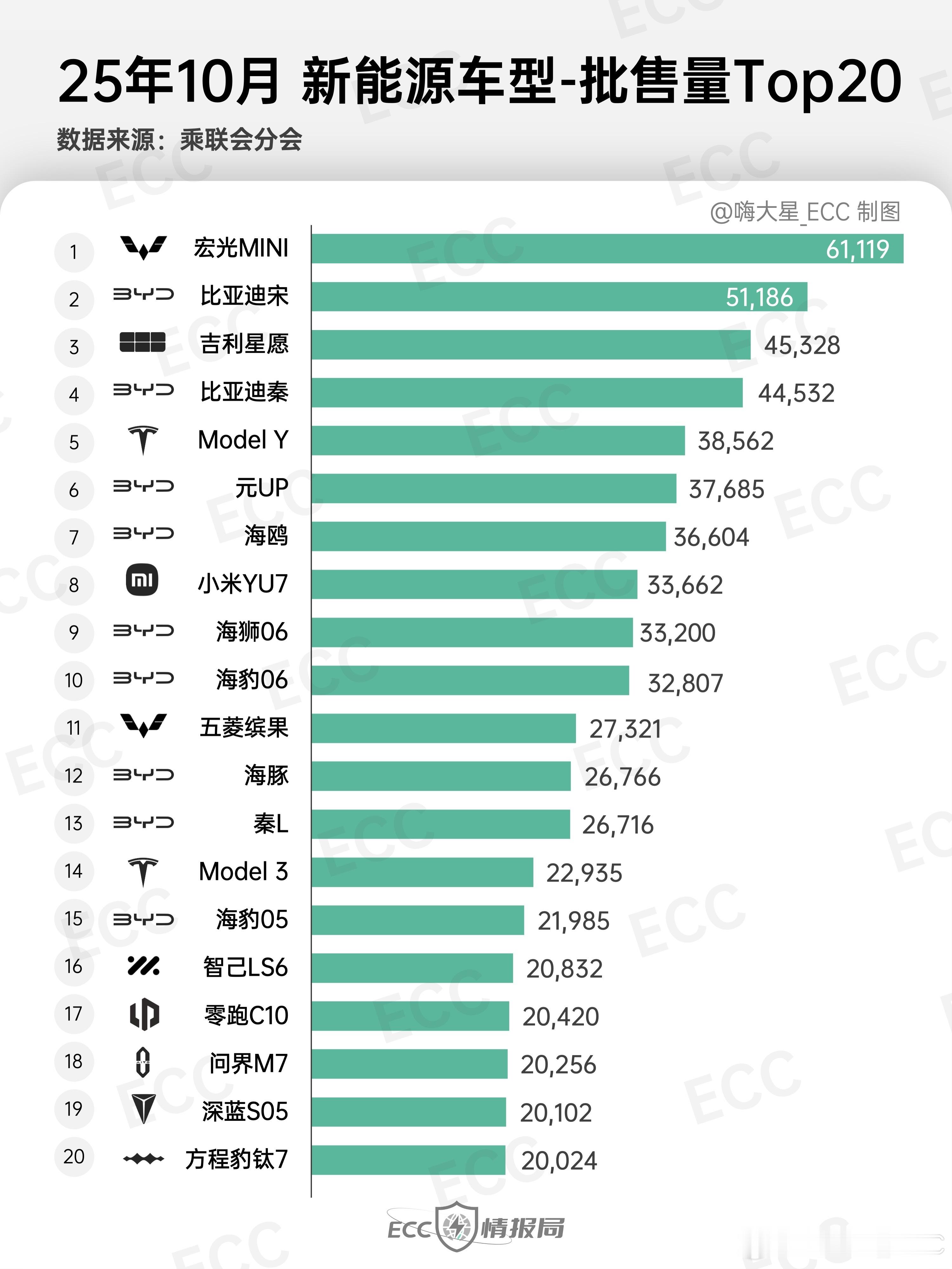 10 月新能源车型销量榜单,前十里比亚迪占了 6 个[666]