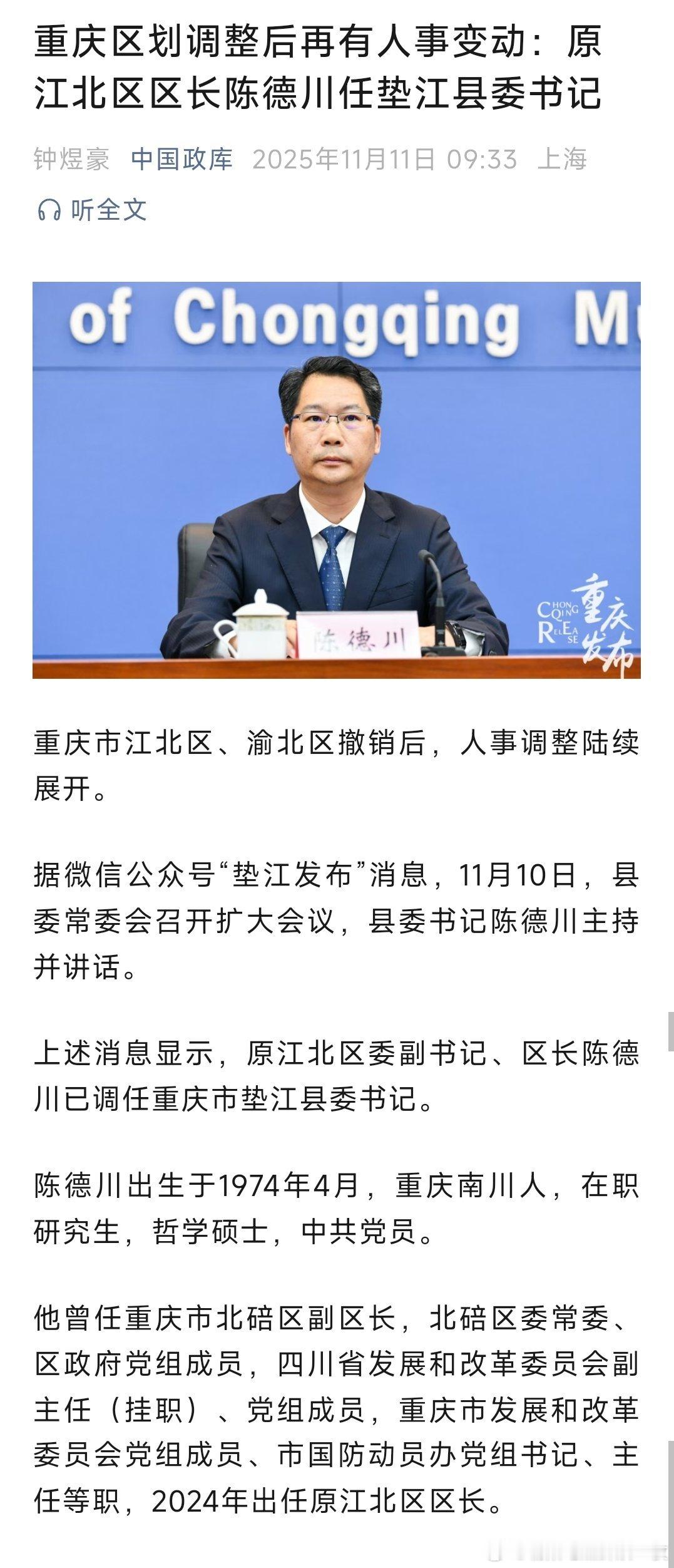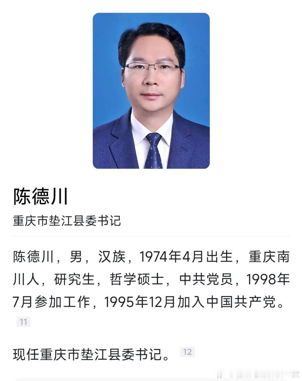 原江北区区长陈德川任垫江县委书记。