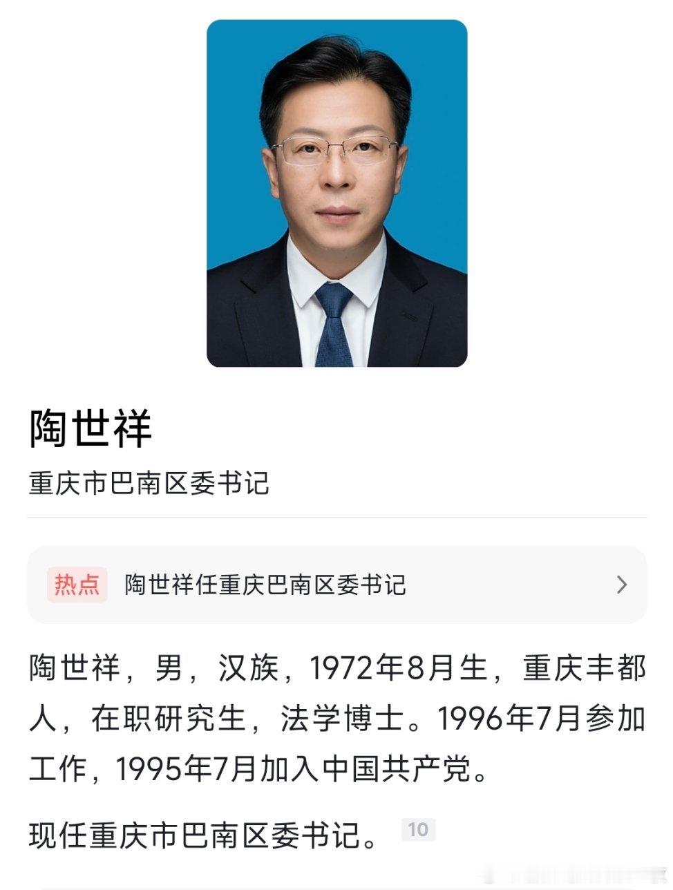 重庆市原江北区委书记陶世祥已任巴南区委书记;