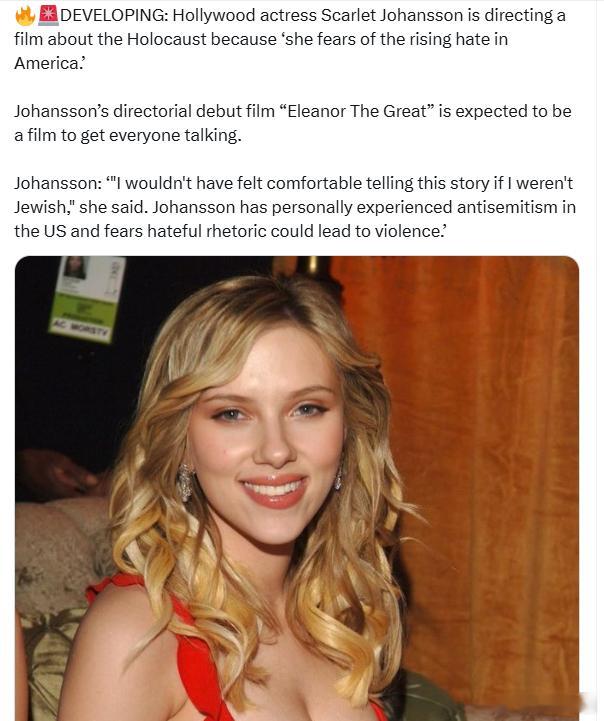 好莱坞女演员斯嘉丽·约翰逊正在执导一部关于大屠S的电影,因为“她担心美国日益增长的仇恨情绪”。
