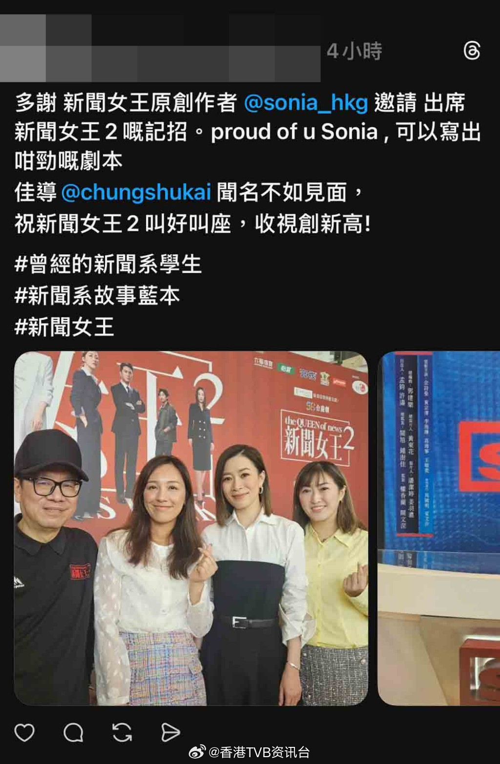 由TVB与优酷联合制作的台庆剧《新闻女王》去年播出时掀起全城热话,剧中金句连场,让观众看得热血沸腾。《新闻女王2》将于今晚(11月10日)晚上8时半在翡翠台首播。近日,一众主演包括包括佘诗曼、黄宗泽、高海宁、李施嬅、马国明、谭俊彦、王敏奕、吴业坤及陈晓华等连日忙于宣传。在日前的宣传活动上,除了星光熠熠的演员阵容,原作者卢咏诗(Sonia)亦罕有现身,引起网民关注,更有人在社交平台分享与这位幕后功臣的合照。