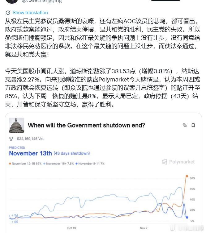 美国参议院已正式通过临时拨款法案(CR),以结束民左党导致的政府关门——该法案现
