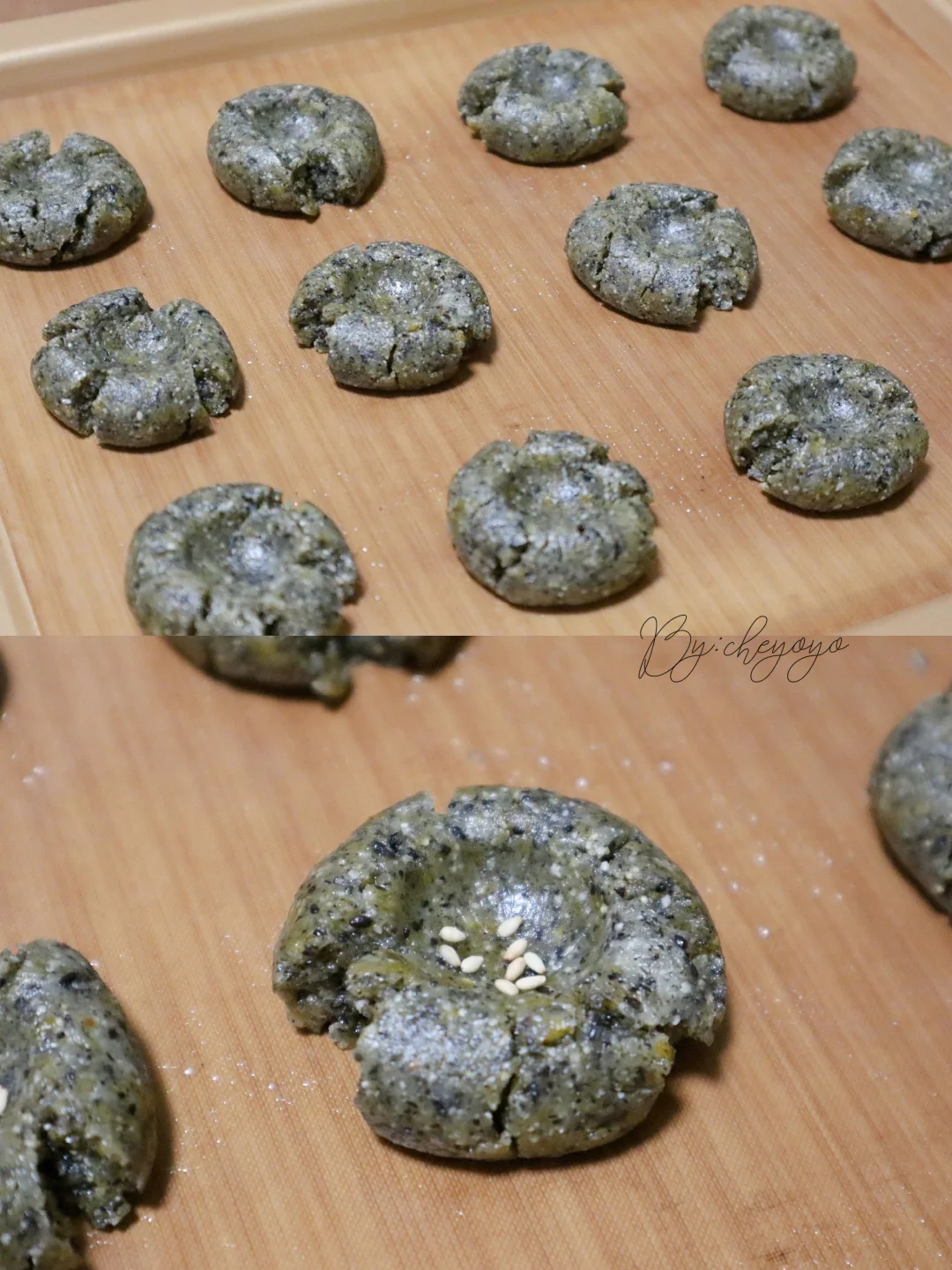 3⃣️面团均匀分成20g/个的小剂子,滚圆后摆到烤盘上,用擀面杖的一头在中间压个深窝,撒上白芝麻;