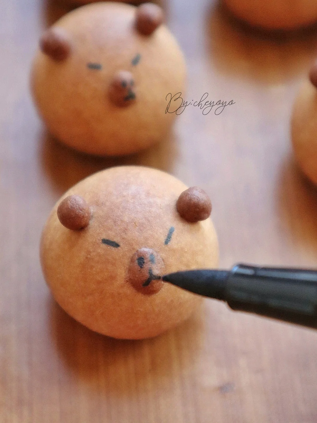 4⃣️送入150度烤箱烘烤30分钟,出炉放晾网上冷却,用色素笔画上眼睛、鼻子、嘴巴就OK啦😍😍