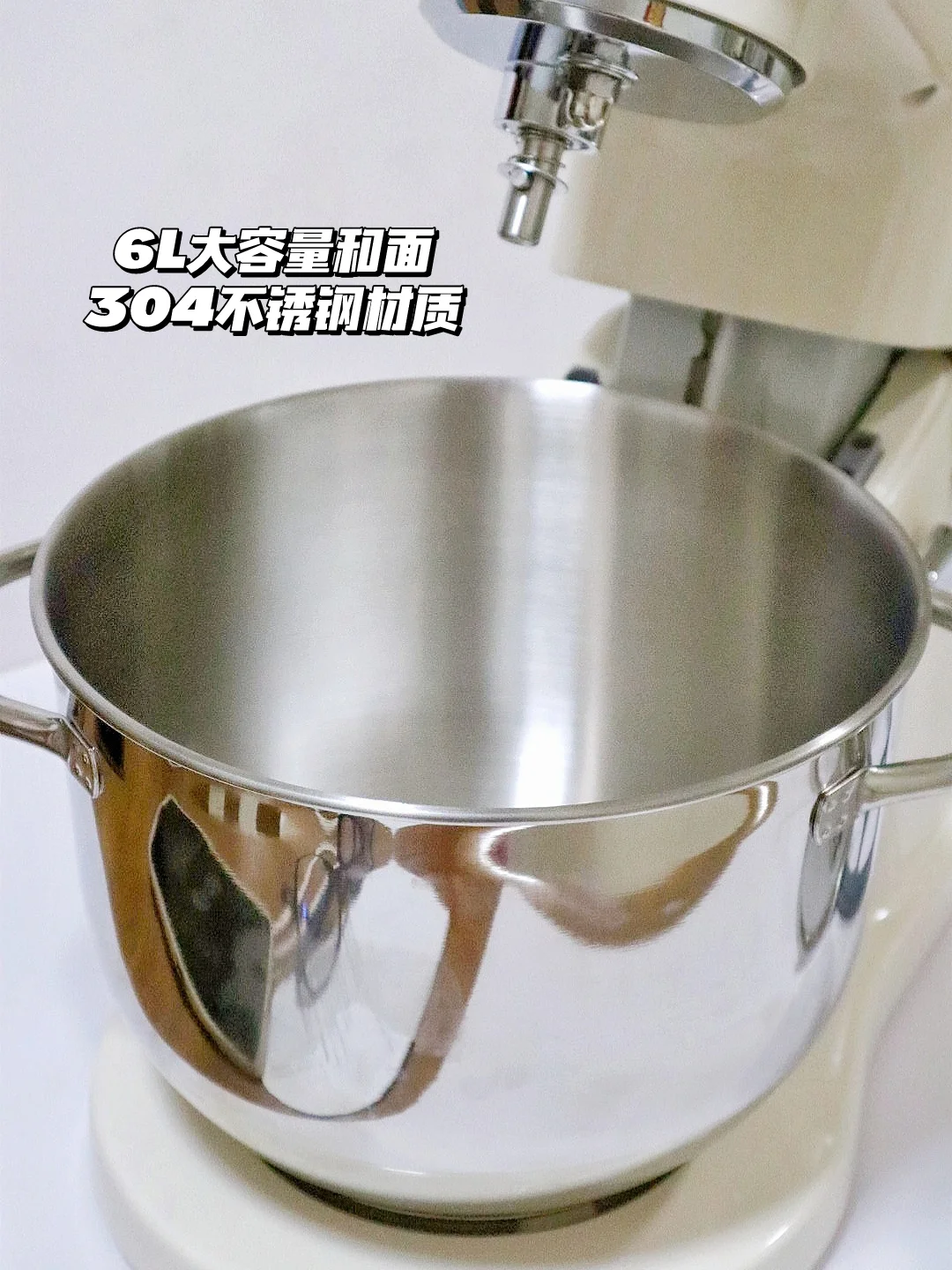 配有不锈钢搅拌桨、打蛋笼、揉面钩,揉面钩还有双重防黑粉设计,能阻隔黑粉掉落,吃得更安心😌。6L的不锈钢桶一次能揉 1000g 面粉,周末给全家做面包都够。