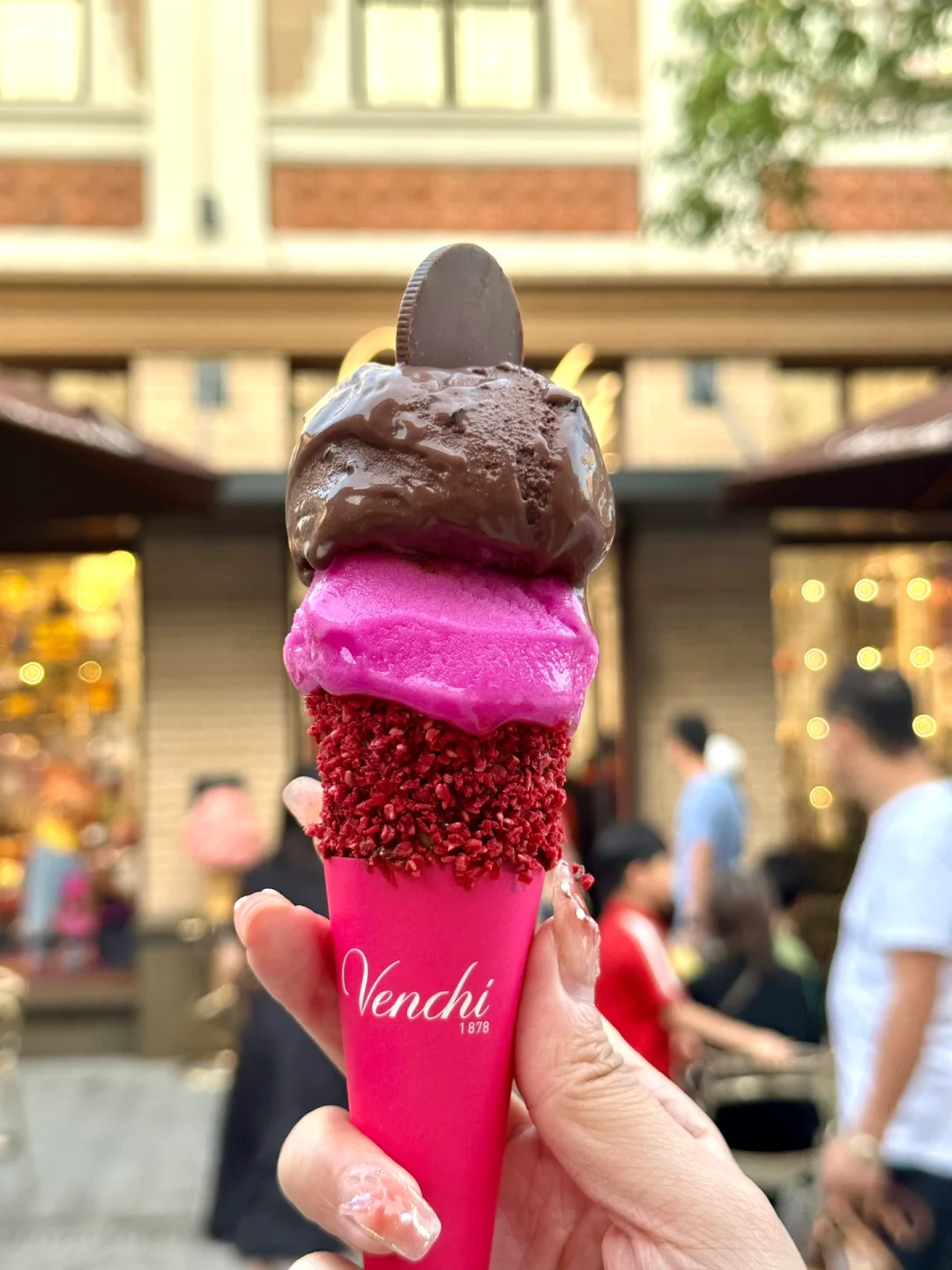 3⃣️推荐一款好吃的冰激凌,叫做【Venchi】排队人超多,推荐巧克力口味加火龙果口味🍦火龙果口味的是和Valentino联名的Pink PP哦!非常清爽的口感 ☺️