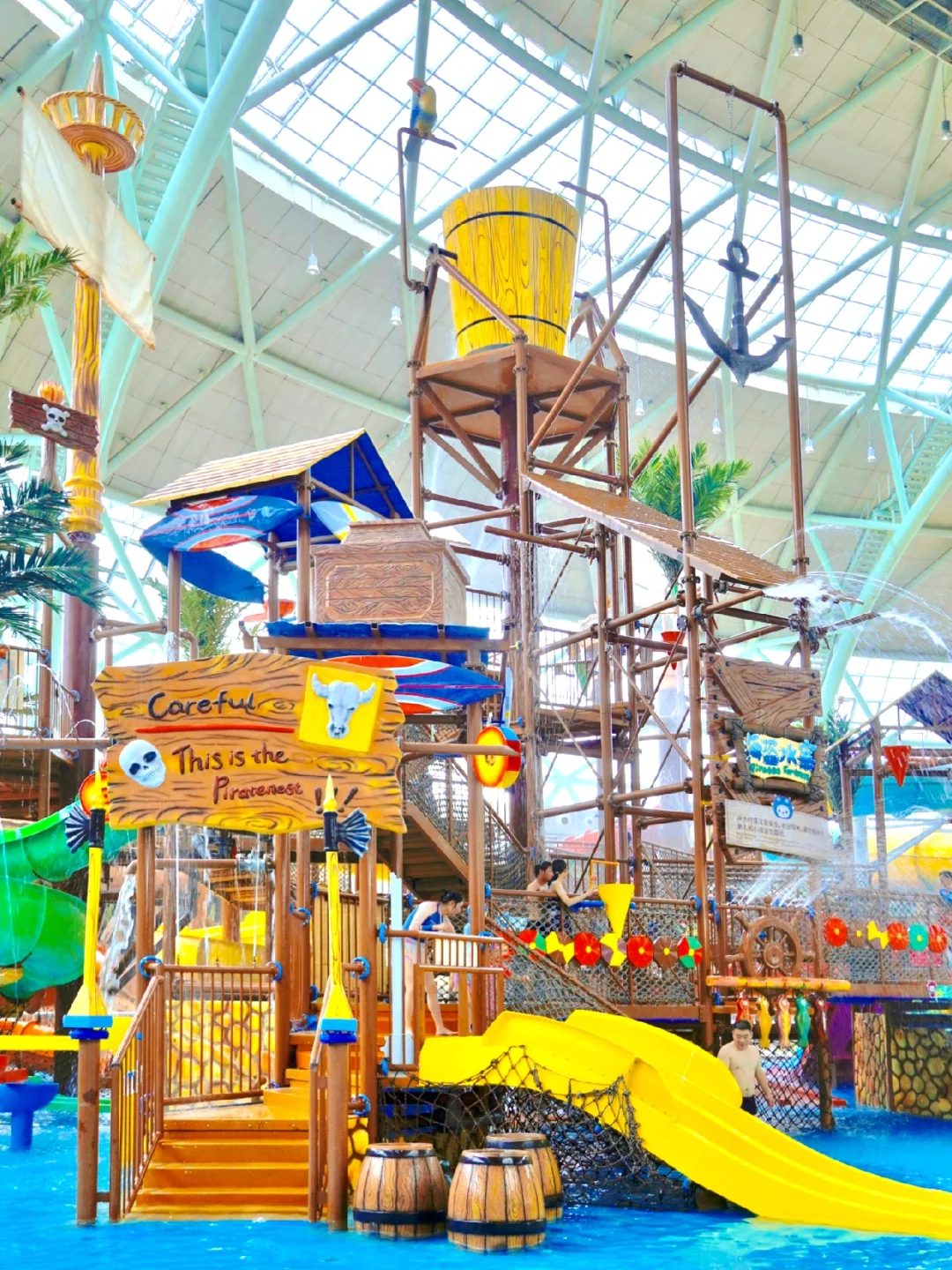 3⃣ 海盗水寨:里面有螺旋水滑梯、轮转水风车、直线滑梯、攀爬网等好玩的项目,水寨顶部还有一个超级大翻桶,时不时洒下满天的水花,好多人开心到尖叫👏