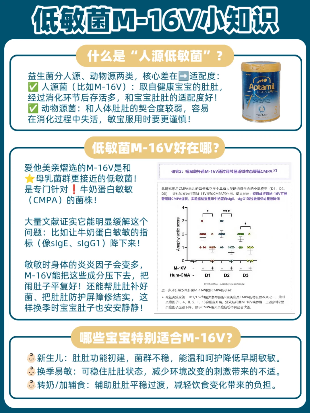 亲熠足量添加270亿低敏菌M-16V,作为健康宝宝肚肚同款,适应性更好。它是专门针对❗牛奶蛋白敏敏(CMPA)的菌株!大量文献证实它让牛奶蛋白敏敏的指标(像sIgE、sIgG1)降下来!而且敏敏时身体的炎炎因子会变多,M-16V能把这些成分压下去,把闹肚子平复好!还能帮肚肚补好菌、把肚肚防护屏障修结实,这样换季时宝宝肚子也安安静静!这个亲和低敏的菌株,再配合百种结构益生元作为持久养料,经临床实证,能帮助降低52%的敏敏风险。