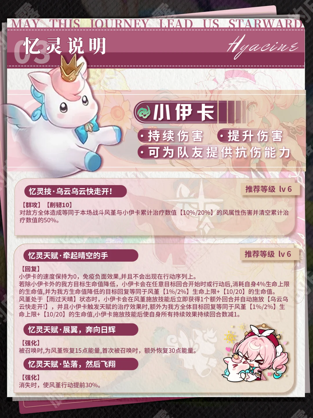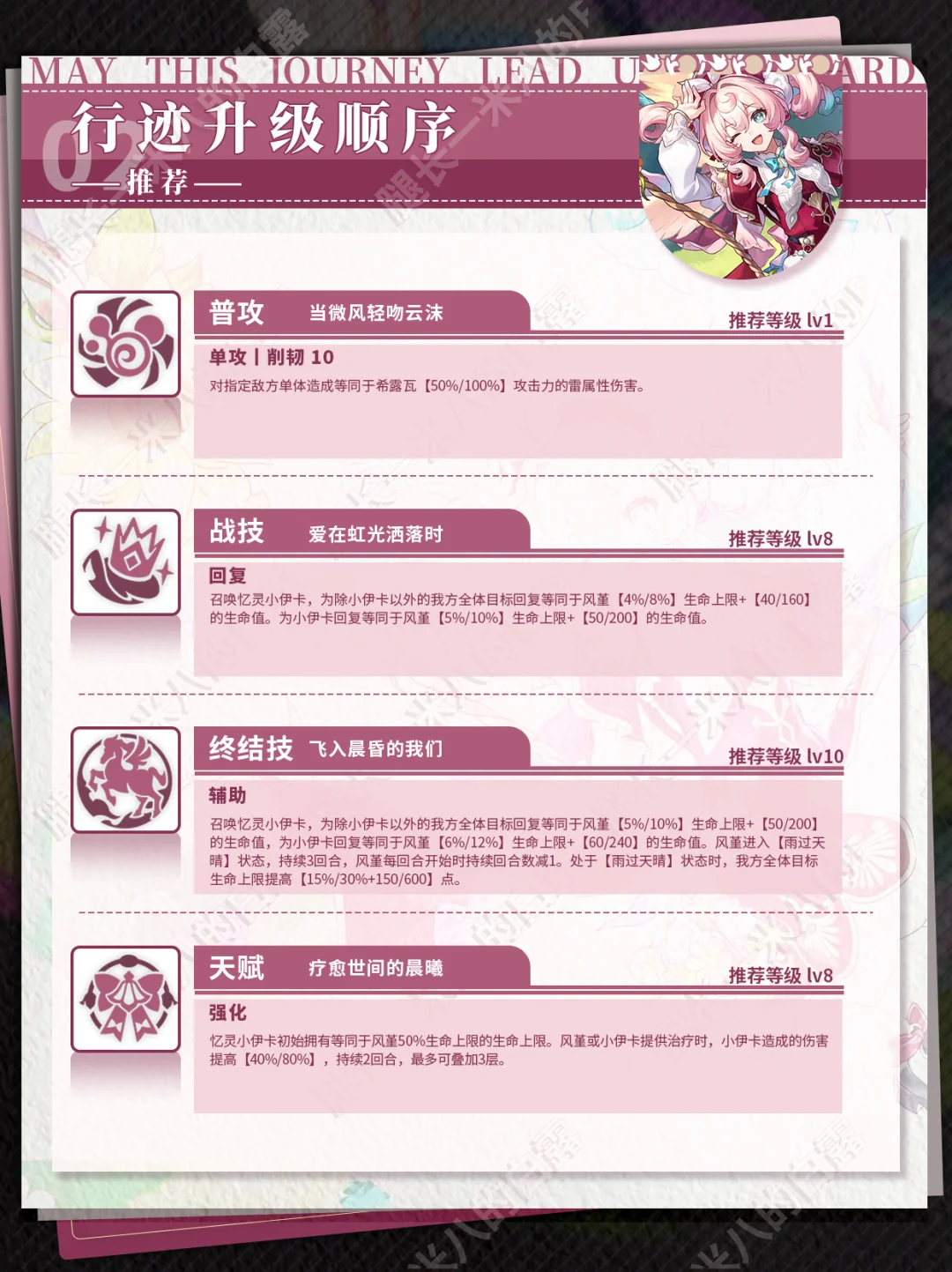 天空…应我的祈愿:小伊卡施放忆灵技清空累计治疗数值改为12%,小伊卡在场时,我方全体目标的全属性抗性穿透提高20%。