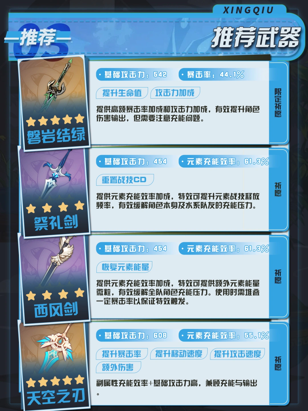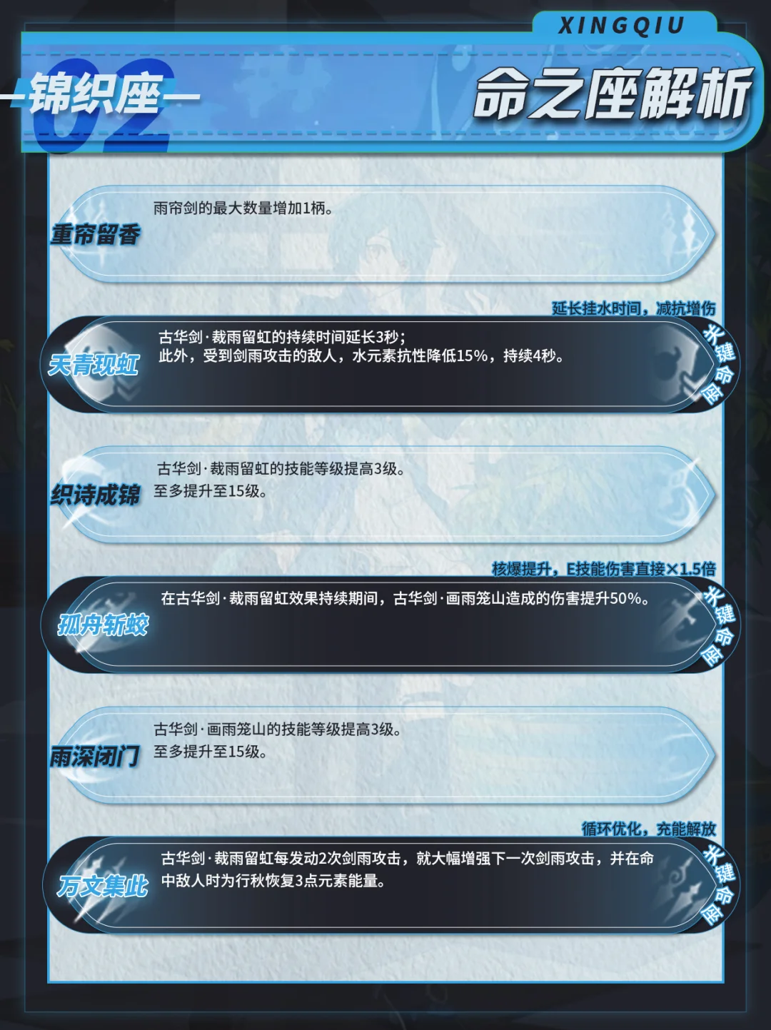 天青现虹:古华剑·裁雨留虹的持续时间延长3秒;此外,受到剑雨攻击的敌人,水元素抗性降低15%,持续4秒。