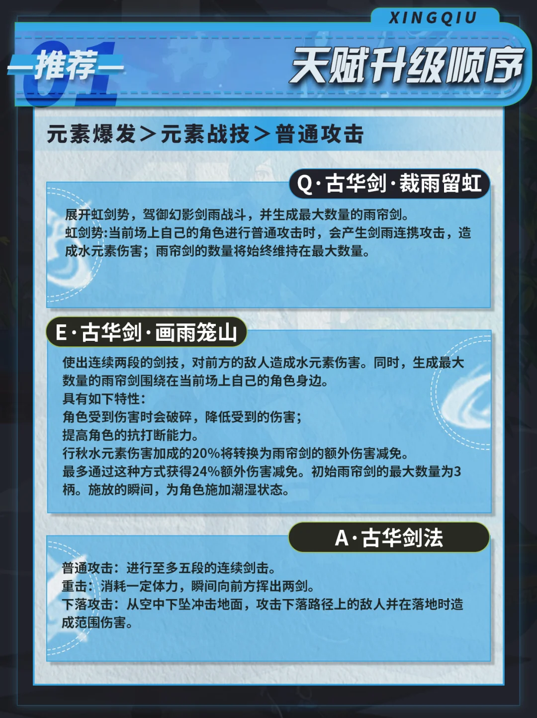 万文集此:古华剑·裁雨留虹每发动2次剑雨攻击,就大幅增强下一次剑雨攻击,并在命中敌人时为行秋恢复3点元素能量。