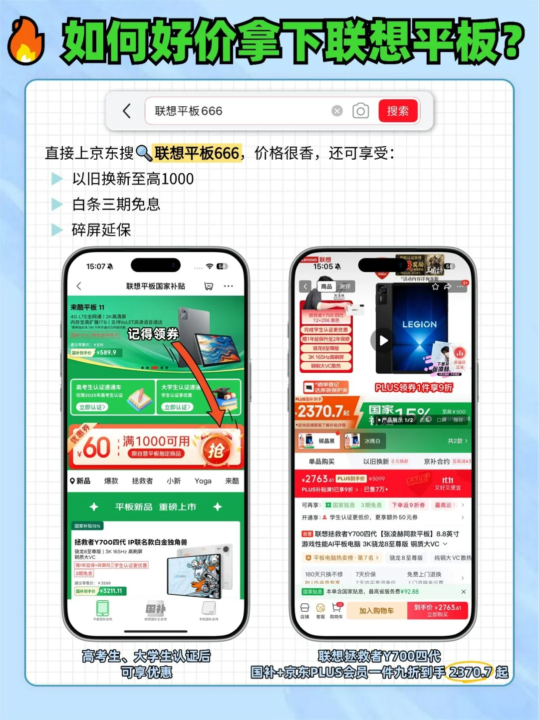 大家买联想平板的话,直接上京东搜联想平板666,价格很香,还可享受以旧换新至高1000+白条三期免息+碎屏延保。
