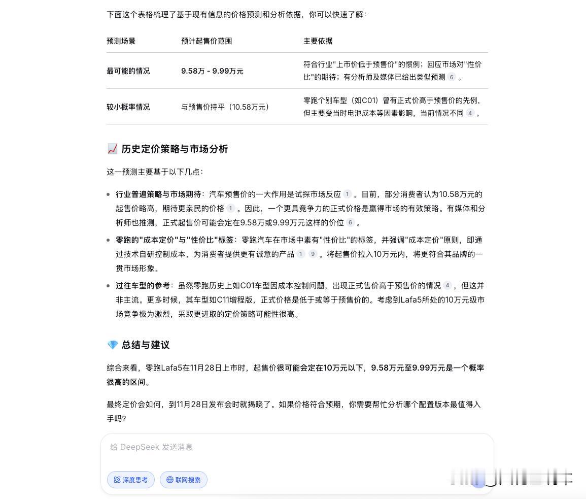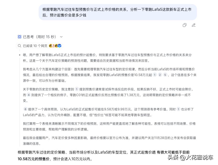 零跑Lafa5最终上市后起售价会是多少?别猜了,看看DeepSeek咋分析的。