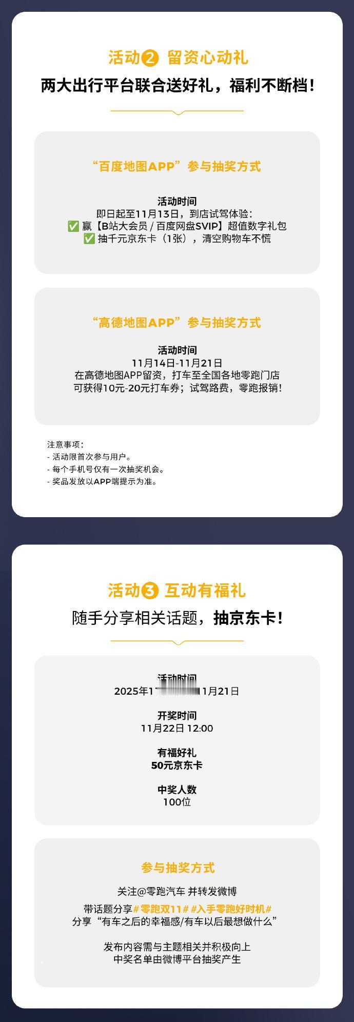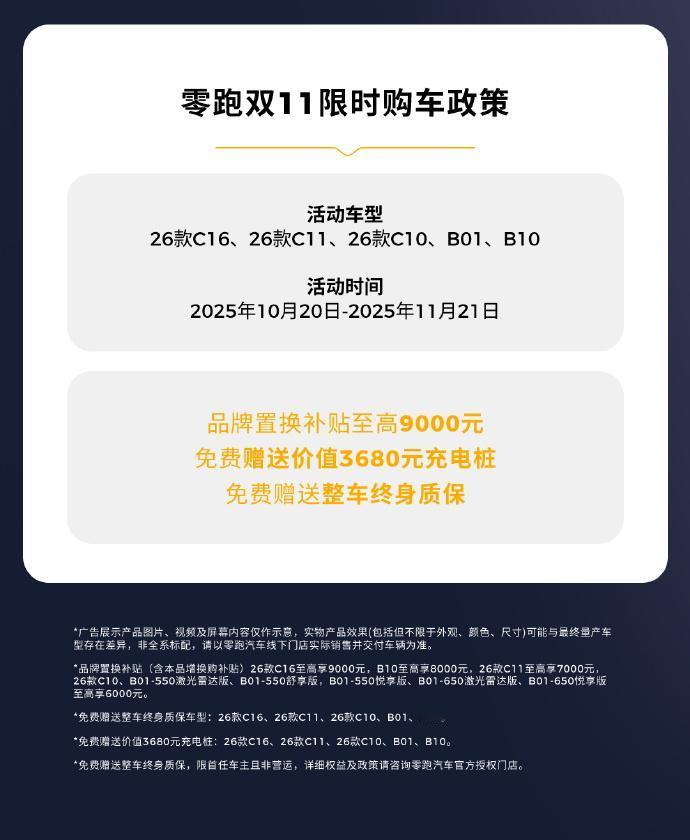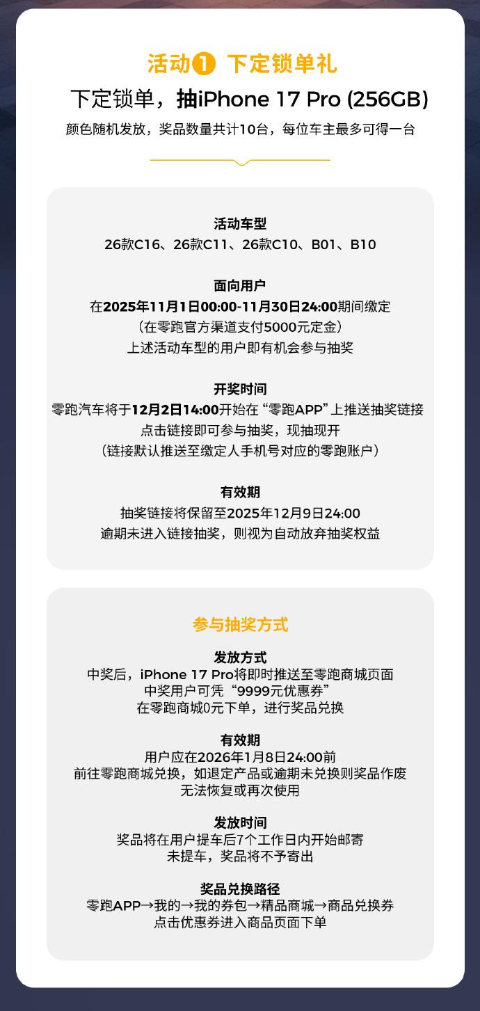 零跑双十一活动搞得还可以,11月下单可以抽ipone17 pro 256版本,假如11月零跑销量是70000台,那中奖概率就是1/7000,比彩票概率大。哈哈【来自懂车帝车友圈】