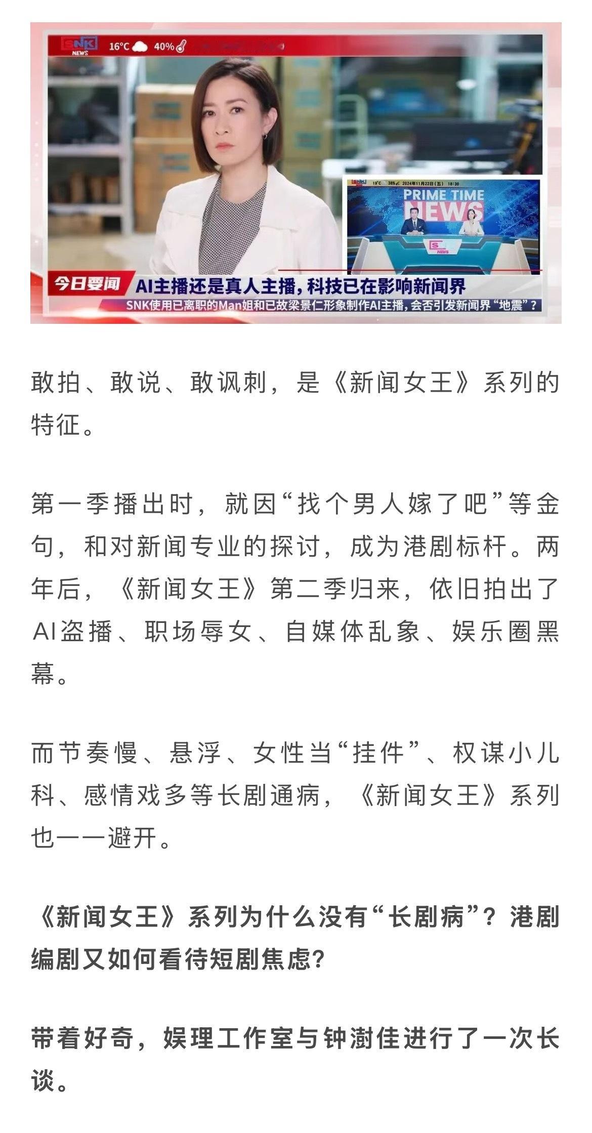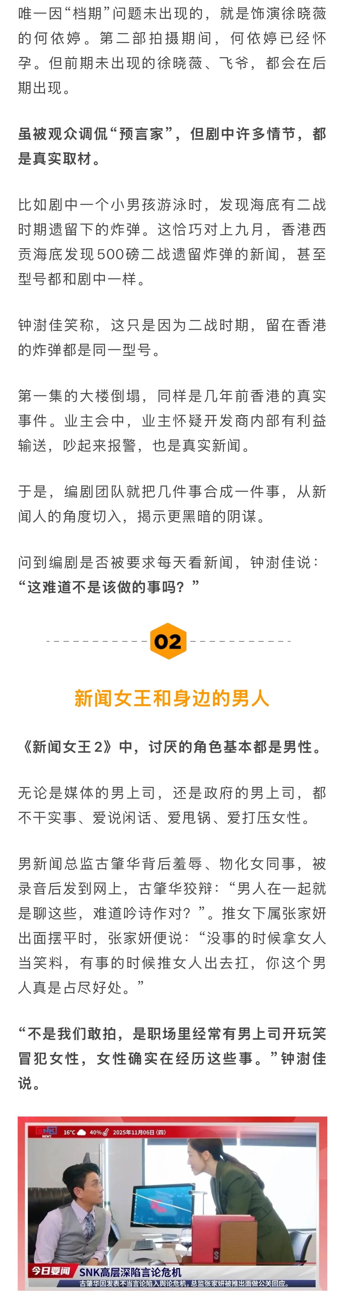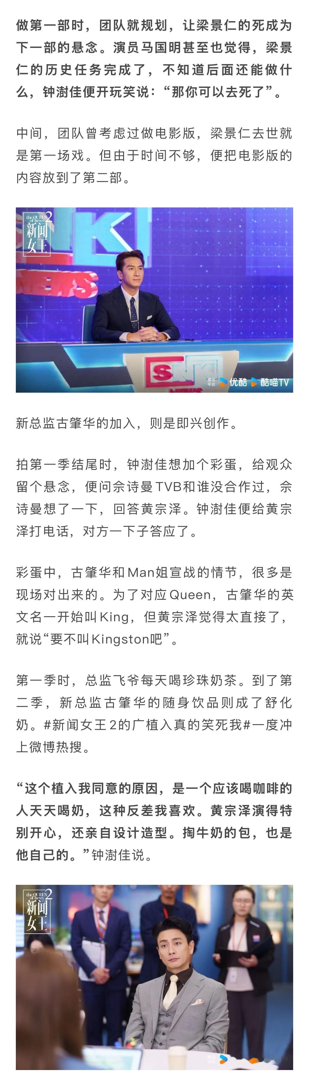 《新闻女王2》热播,新浪娱乐 工作室和总监制钟澍佳 进行了一次幕后对话。谈及第二季一开播,第一部的男主角梁景仁就死了。钟澍佳回应表示,编剧团队在2022年底重新创作“新闻女主播”的故事时,就定了两个方向:一是媒体内部的职场斗争,二是新老媒体之争。也因此,马国明饰演的梁景仁死亡,并非演员没有档期,而是来自于原剧本的设定。第二部男主角的黄宗泽加盟,源于钟澍佳在为第一部即兴创作彩蛋时,佘诗曼谈到她在TVB和黄宗泽还没有合作过。谈及有观众猜测佘诗曼和黄宗泽之间会不会有感情戏时,钟澍佳直言“想多了。黄宗泽这张帅脸,就适合演古肇华这个讨厌的角色,这样观众才会对他又爱又恨。”至于引发热议的广告植入情节,钟澍佳也有透露表示:“黄宗泽演得特别开心,还亲自设计造型。掏牛奶的包也是他自己的。”《新闻女王》第二部的剧本打磨了一年多。因为一直纠结最后一个大案,直到2025年4月开机前,剧本才写完了18集,最后7集是边拍边写。编剧团队还有几个特别的创作原则:一是不能出现无效对白。二是所有编剧要一起创作。三是不能乱改剧本…谈及未来是否有第三季时,钟澍佳表示要看第二季的表现:“如果数据再好一点,就有资源和机会做第三部。”此外,佘诗曼的下一部戏《正义女神》,目前已经完成后期…↓