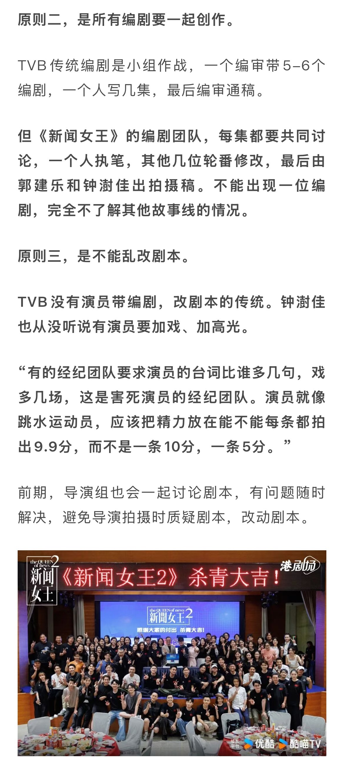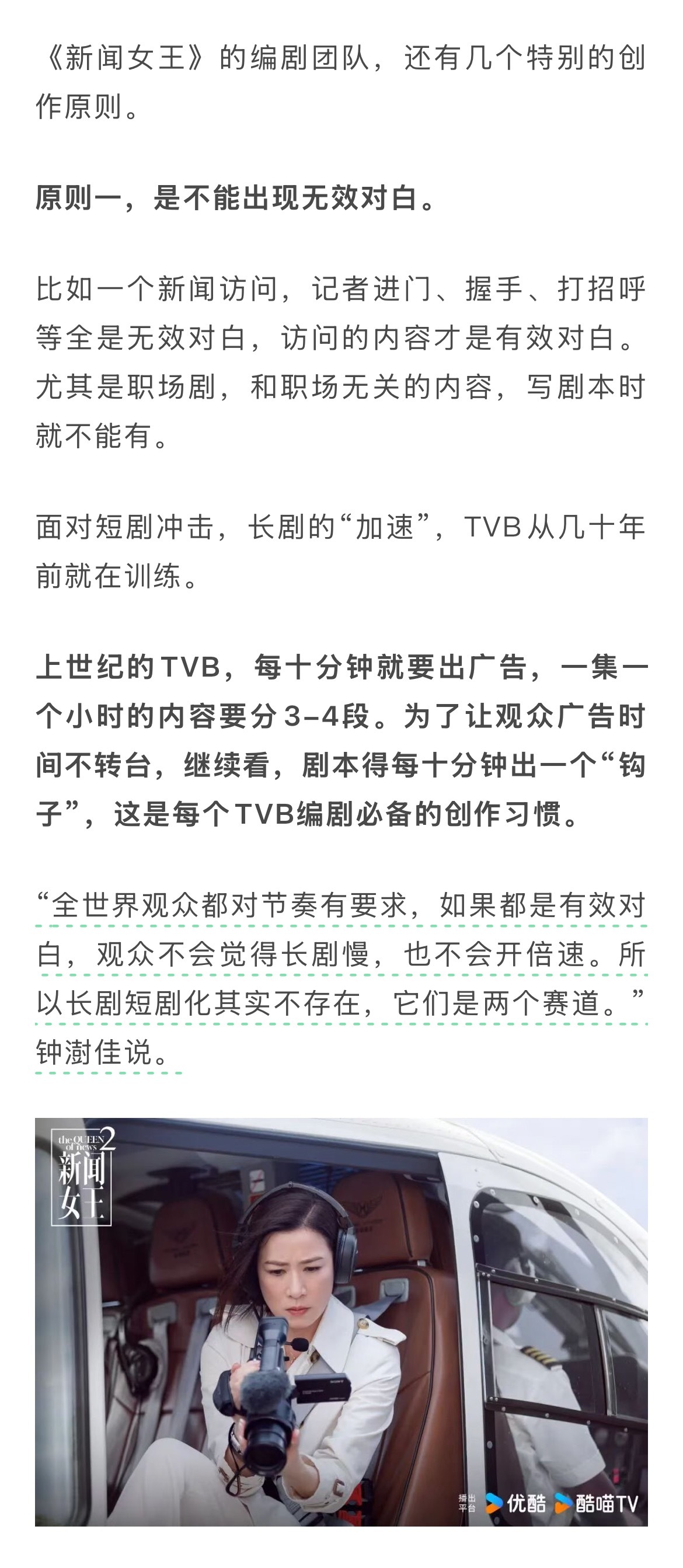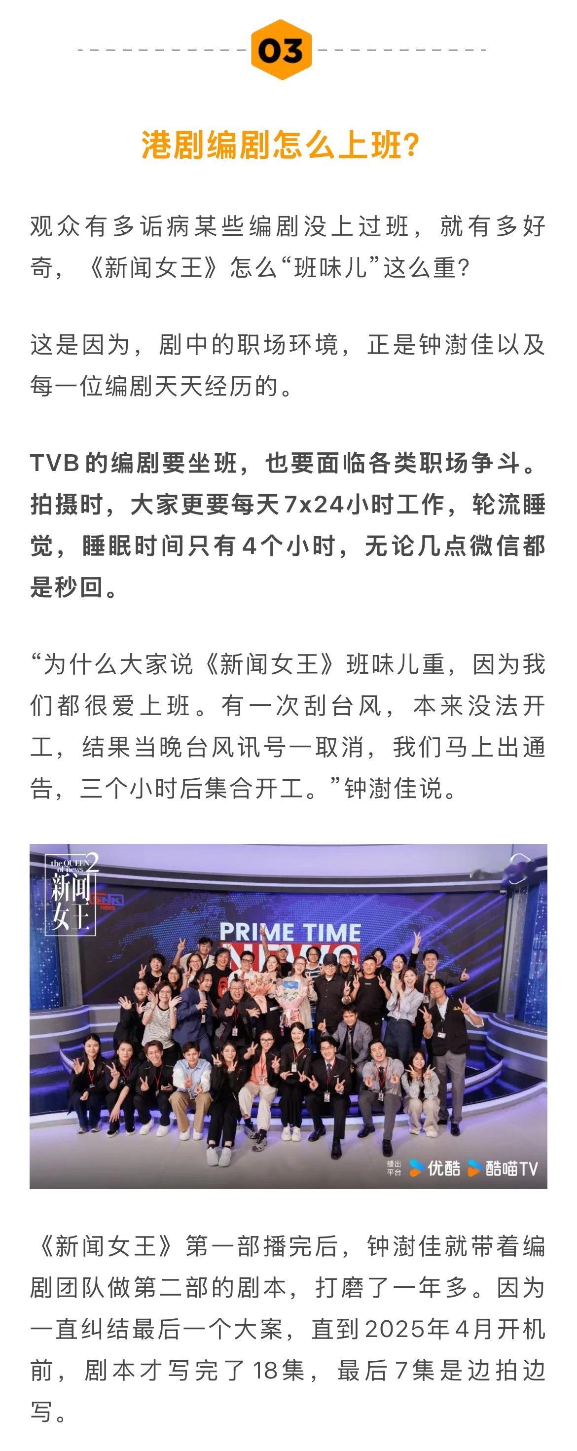 《新闻女王2》热播,新浪娱乐 工作室和总监制钟澍佳 进行了一次幕后对话。谈及第二季一开播,第一部的男主角梁景仁就死了。钟澍佳回应表示,编剧团队在2022年底重新创作“新闻女主播”的故事时,就定了两个方向:一是媒体内部的职场斗争,二是新老媒体之争。也因此,马国明饰演的梁景仁死亡,并非演员没有档期,而是来自于原剧本的设定。第二部男主角的黄宗泽加盟,源于钟澍佳在为第一部即兴创作彩蛋时,佘诗曼谈到她在TVB和黄宗泽还没有合作过。谈及有观众猜测佘诗曼和黄宗泽之间会不会有感情戏时,钟澍佳直言“想多了。黄宗泽这张帅脸,就适合演古肇华这个讨厌的角色,这样观众才会对他又爱又恨。”至于引发热议的广告植入情节,钟澍佳也有透露表示:“黄宗泽演得特别开心,还亲自设计造型。掏牛奶的包也是他自己的。”《新闻女王》第二部的剧本打磨了一年多。因为一直纠结最后一个大案,直到2025年4月开机前,剧本才写完了18集,最后7集是边拍边写。编剧团队还有几个特别的创作原则:一是不能出现无效对白。二是所有编剧要一起创作。三是不能乱改剧本…谈及未来是否有第三季时,钟澍佳表示要看第二季的表现:“如果数据再好一点,就有资源和机会做第三部。”此外,佘诗曼的下一部戏《正义女神》,目前已经完成后期…↓