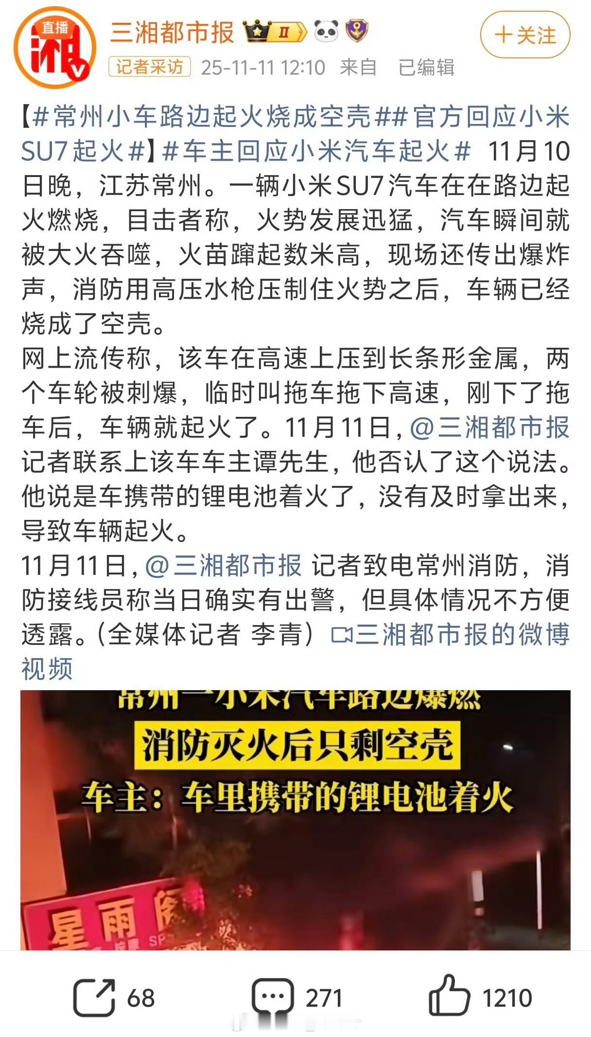 看汪汪队因为“小米汽车起火视频”在叫我就想笑……毕竟这些人擅长不了解事实是怎样,真相是:起火源是车主自行放置在车内的改装锂电池,与车辆本身的电池系统完全无关。从视频可以清晰看出:· 火势集中在乘员舱内部· 车辆大灯在起火时依然亮着,证明车辆高压电池完好无损· 车主已承认是"车里带的锂电池着火",与车辆本身无关这起事件再次提醒大家:请勿私自改装或使用不规范的锂电池产品,并且不要在车内放置易燃易爆物品。锂电池一旦起火,速度极快,后果严重。所以,这次事件与车辆质量无关,而是用车安全问题。电动车电路不要轻易改动,更不要随意加装锂电池,这既是对自己负责,也是对他人负责。