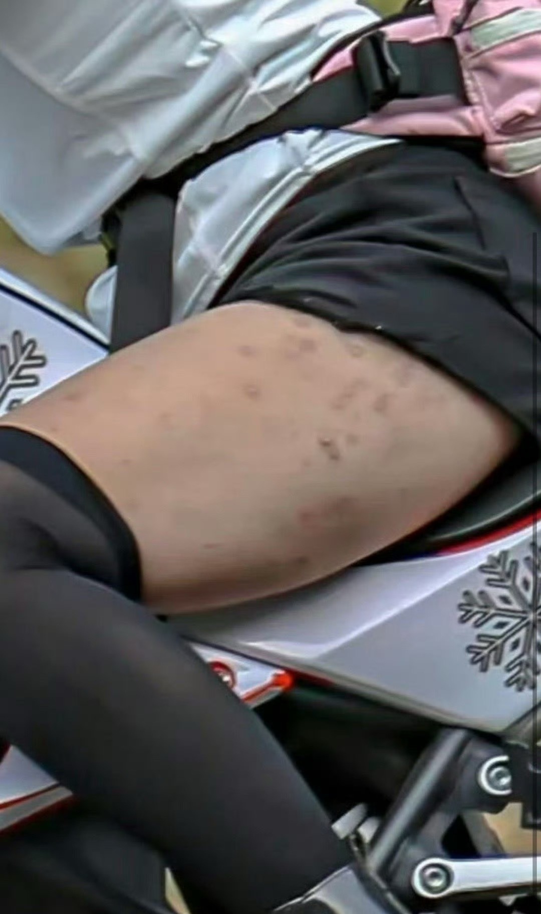 穿短裤骑机车最怕遇到的事,溅一腿泥点子