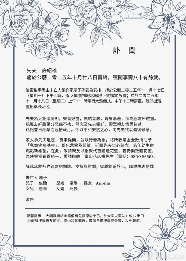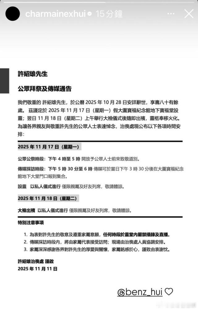 許紹雄離世丨家屬公布喪禮細節 11月17日安排一小時公祭時段.資深演員「Benz雄」許紹雄於10月28日安詳辭世,終年76歲,消息震驚娛樂圈。其家屬今日(11日)透過IG發布公眾拜祭及傳媒通告,詳述喪禮安排。家屬公布,將於11月17日(星期一)假大圍寶福紀念館地下寶福堂為許紹雄先生設靈。翌日(11月18日,星期二)上午將舉行大殮儀式,儀式後隨即出殯,靈柩奉移火化。設靈及大殮出殯均以私人儀式進行,僅限親屬及好友列席。許紹雄家屬公布,為了讓各界親友及敬重許紹雄的公眾人士表達悼念,治喪處特別於11月17日下午 4 時至 5 時在大圍寶福紀念館安排了公眾公祭時段,屆時將開放予公眾人士前來致意,送別許紹雄。家屬亦安排了傳媒採訪時段,但為表對許紹雄的敬意及尊重家屬意願,任何時段於靈堂內均嚴禁攝錄及直播。家屬表示深深感謝各界對許紹雄的厚愛與關懷,會銘感於心。