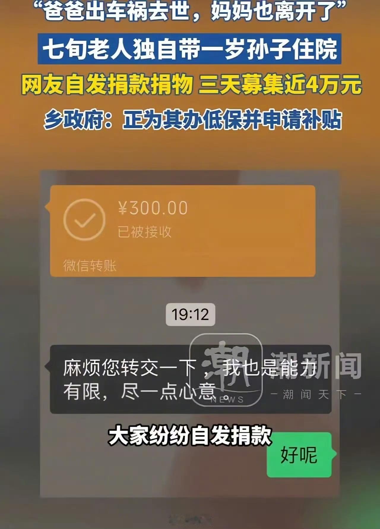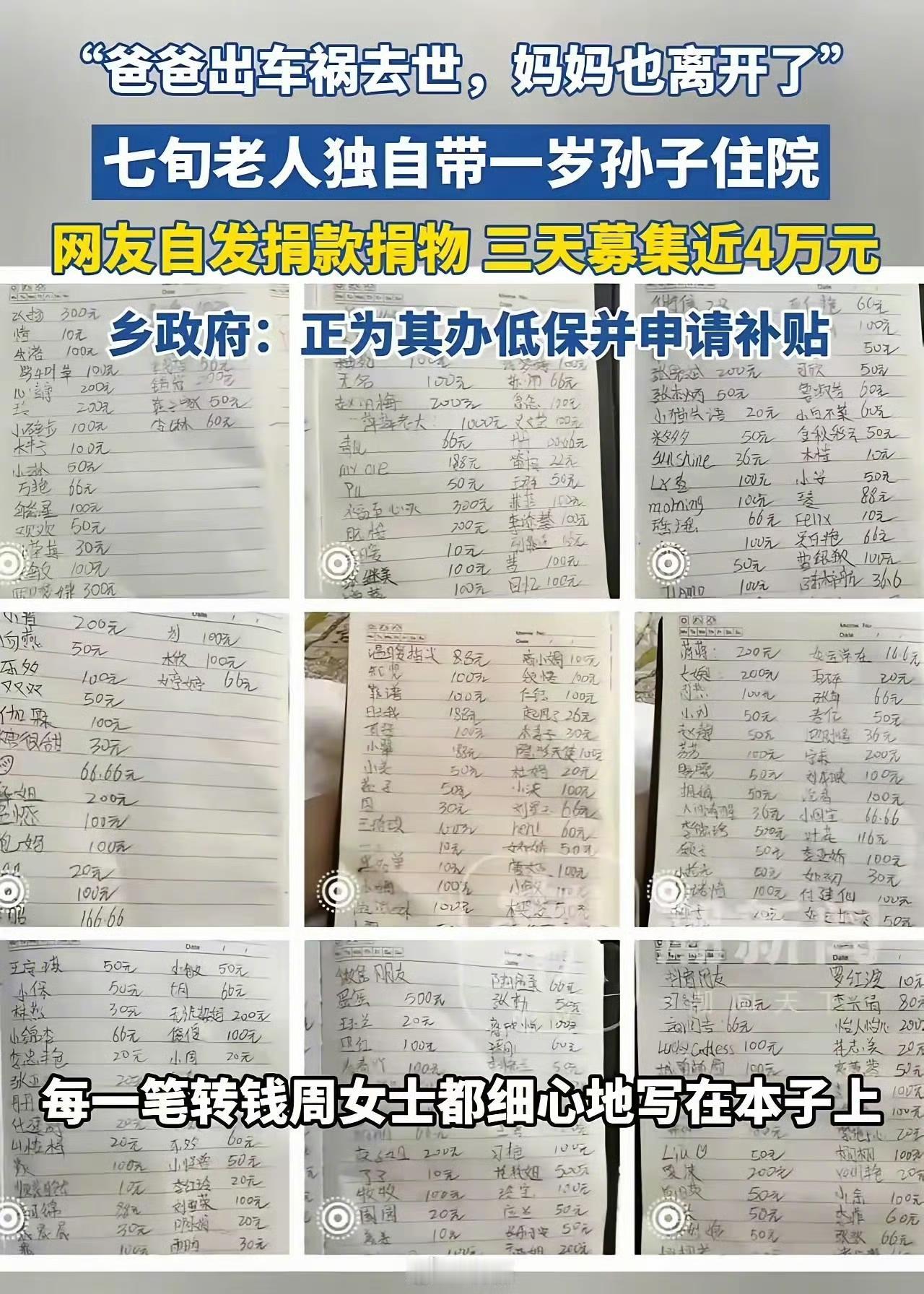 前几天在云南,一位妈妈在医院带孩子住院时,注意到隔壁病床有个一岁多的宝宝,身边只有一位70多岁的老爷爷陪着。她本来以为孩子爸妈是上班忙,可过了两天还是没见到人,就忍不住问了句:“孩子的爸爸妈妈呢?” 没想到这一问,爷爷当场就哭了。 他说,孩子的爸爸在孩子才两个月时就因车祸去世了,妈妈没过多久也离家出走,再没消息。孩子从小跟着爷爷奶奶长大,没感受过父爱母爱。看着孩子穿着又旧又脏的衣服,头上还包着纱布,女子心里特别难受。 第二天,她特意回家收拾了一大包自己孩子小时候的干净衣服,带给爷爷,还说:“您别嫌弃,都是洗干净的,就怕你们没带换洗衣物。”接着她又给孩子煮了碗面,爷爷看着孙子吃得狼吞虎咽,一边抹眼泪,一边又感动又发愁——自己年纪大了,将来孩子怎么办? 这位妈妈知道自己能力有限,就把爷爷和宝宝的情况发到了网上。本来没抱太大希望,没想到第二天手机就被刷屏了,好多热心网友都想捐款帮忙。 爷爷没有智能手机,她就帮忙把所有善款都换成现金,一笔一笔交到他手里,还坚持拍视频公开记录,让每位好心人都知道:钱真的送到爷爷手上了。 这事真让人心疼。爷爷本来该安享晚年,却遭遇白发人送黑发人,还要独自抚养小孙子。好在遇到了这么多好心人,就像冬天里的阳光一样,帮他们暂时渡过了难关。愿爷爷和宝宝未来的路,能越走越暖。