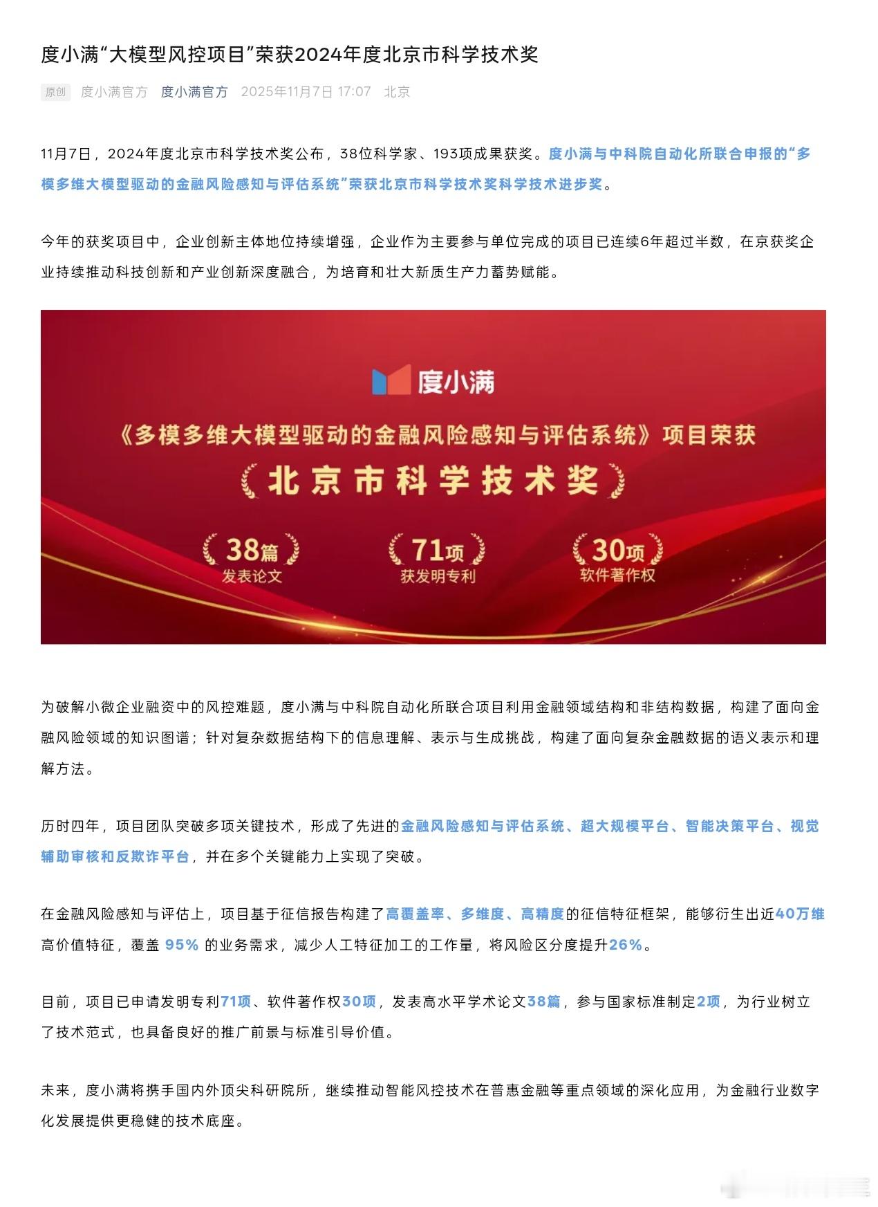 度小满“大模型风控项目”荣获2024年度北京市科学技术奖。
