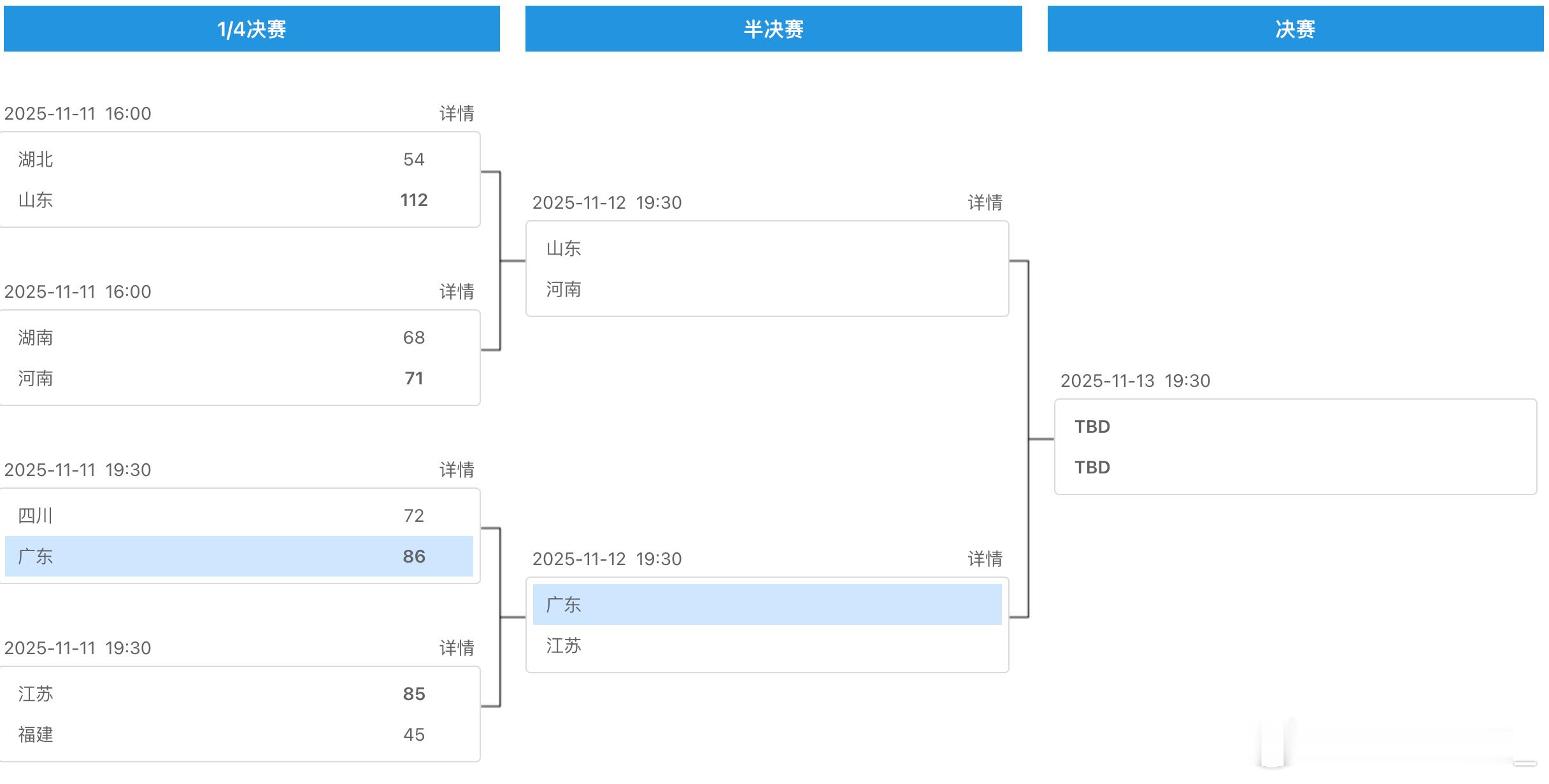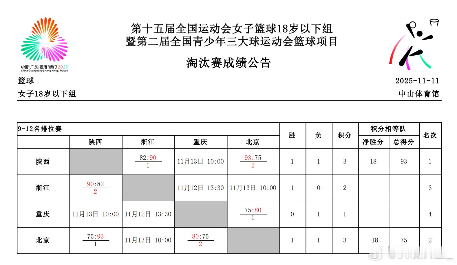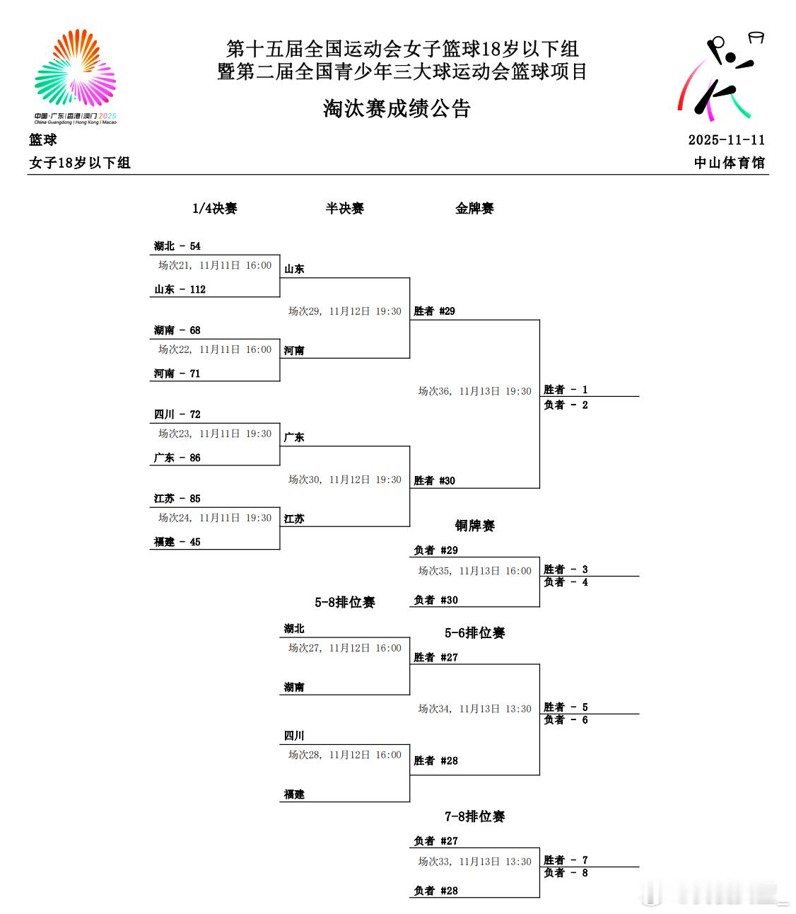 【全运会U18女篮第六日综述:四强名单出炉 河南队准绝杀以下克上闯入四强】U18女篮今天进入淘汰赛和排位赛的争夺,1/4决赛中,山东队大比分战胜湖北队晋级四强。小组第二的河南队依靠原筠涵终场前1.7秒的三分准绝杀,以下克上战胜湖南队,半决赛中将面对山东队。广东队顶住四川队第四节的反扑,涉险过关。江苏队大比分战胜福建队,将在半决赛迎来广东队的挑战。9-12名排位赛中浙江队和北京队拔得头筹。 [1/4决赛] 湖北队 54-112 山东队,山东队六人得分上双,张子宇13投全中拿下28分,梁雅琦13分,曹秀浩泽和刘柯彤各得12分,刘佳洁11分6助攻,单文珑10分。湖北队仅一人得分上双,赵圆圆11分3助攻。 湖南队 68-71 河南队,河南队三人得分上双,陈妍希24分,周欣怡20分19篮板,原筠涵14分并命中准绝杀。湖南队同样三人得分上双,胡瑞燕 24分7助攻,刘瑞14分6篮板,臧欣妍10分9篮板。 四川队 72-86 广东队,广东队四人得分上双,李泳霖17分6篮板,杜思宇16分8篮板,艾楚姬16分6篮板,刘亚希11分8篮板。四川队三人得分上双,宋诗蓉空砍34分,陈语欣13分7助攻,吴春锫12分8篮板。 江苏队 85-45 福建队,江苏队五人得分上双,汪欣悦14分9篮板,胡梦英14分,赵可欣和贺思瑶各得11分,孙程程10分。福建队仅一人得分上双,方子露12分。 [9-12名排位赛] 陕西队 82-90 浙江队,浙江队五人得分上双,王一茗23分9篮板,陈怡嘉21分6篮板,李思琪17分7篮板,李姝怡和盛叙然各得10分。陕西队四人得分上双,张贺玥狂砍33分8篮板,赵菲21分6篮板,李佳谊和张桐菲分别得到12分和11分。 重庆队 75-80 北京队,北京队孙晗昀28分14篮板,蒋紫涵25分10篮板。重庆队三人得分上双,谷满杰23分7篮板。张译爻19分11篮板,马嘉潞17分。