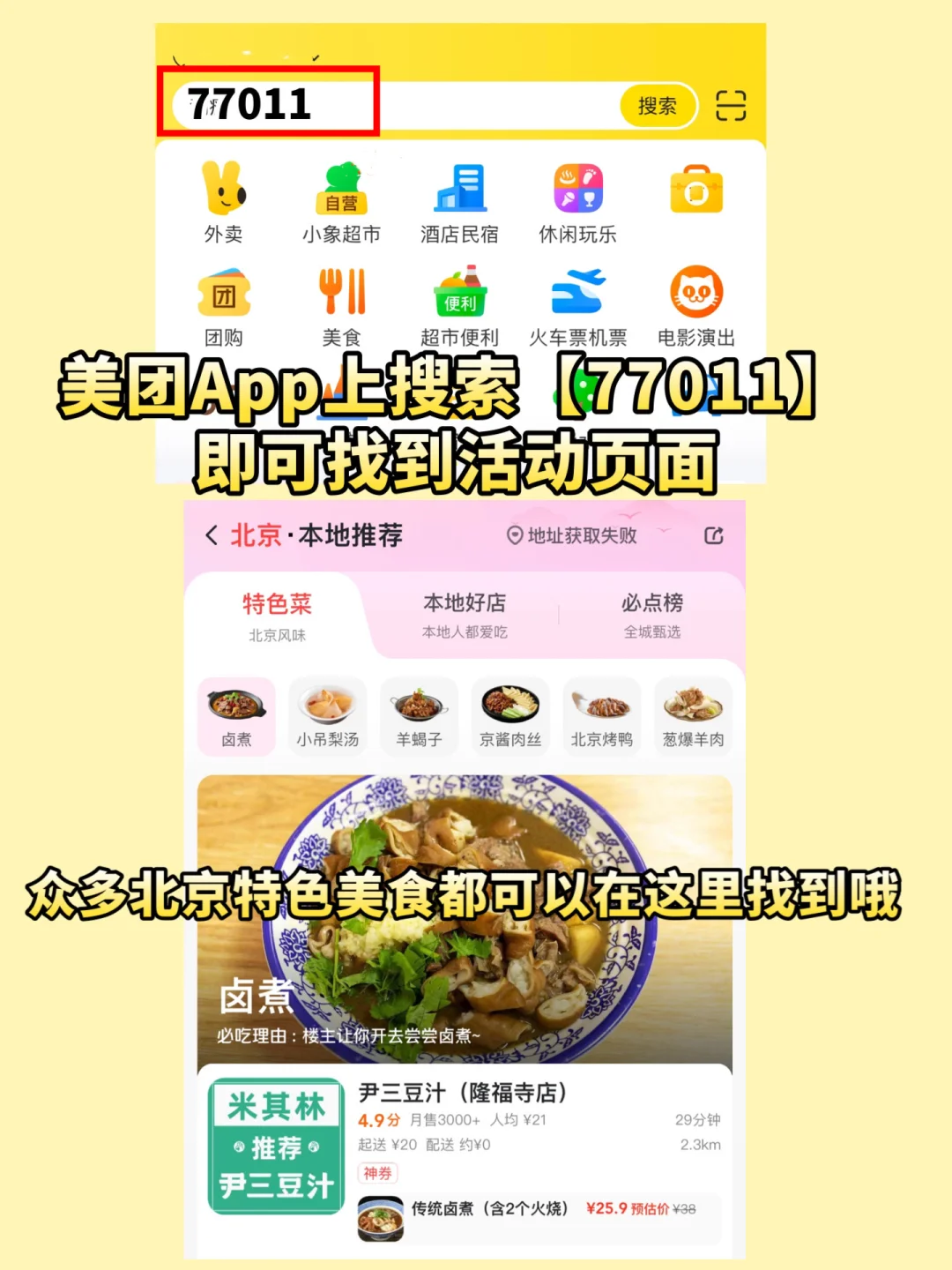 在美团/美团外卖App搜索【77011】进入活动页面,北京特色小吃都可以在美团外卖上点到