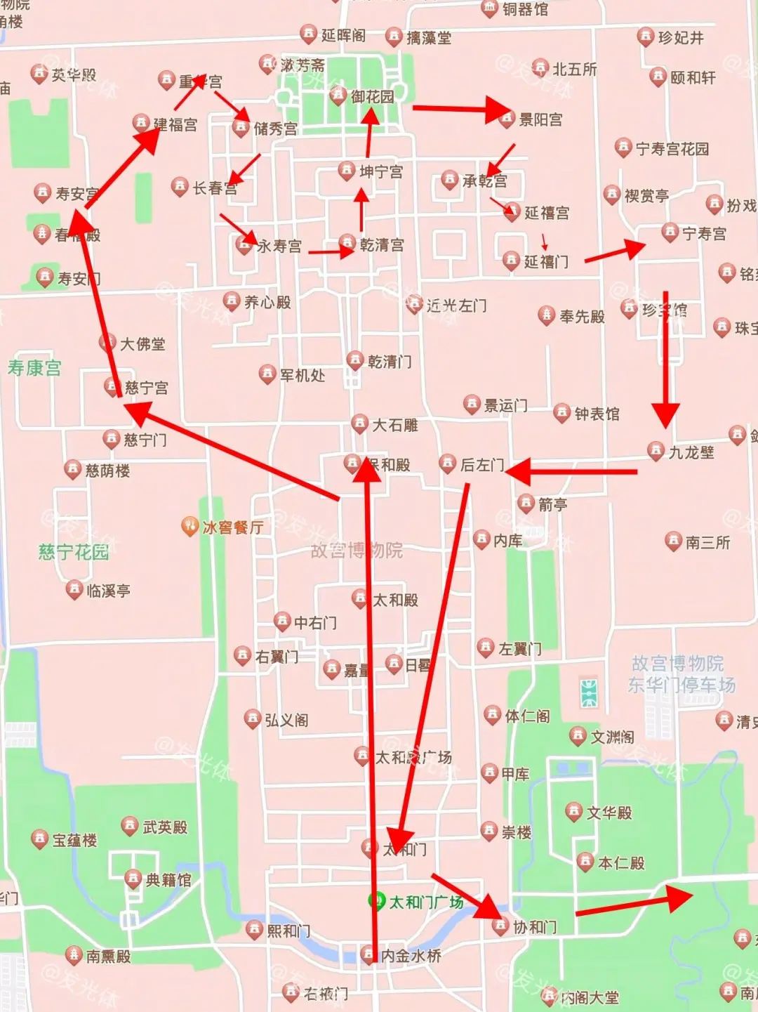 午门进➡️中轴线三殿➡️慈宁宫➡️西六宫➡️乾清宫➡️御花园➡️东六宫➡️太和门➡️协和门➡️东华门出