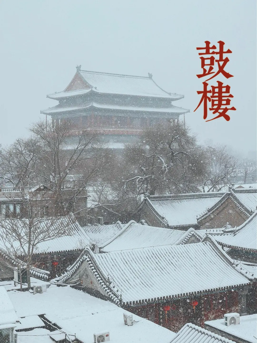 鼓楼红墙配白雪,在鼓楼大街牌子下来张应景的合影!
