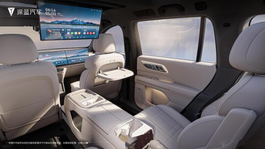 除了设计方面的相似之外,深蓝S09在产品的理念方面,也是和理想一比一还原,同样是大六座的设计,同样是彩电冰箱大沙发的设计,甚至中控屏的设计,后排屏的放置方式,都和理想L9完全一样,只不过,深蓝S09这两个屏幕的尺寸,都比理想更大。