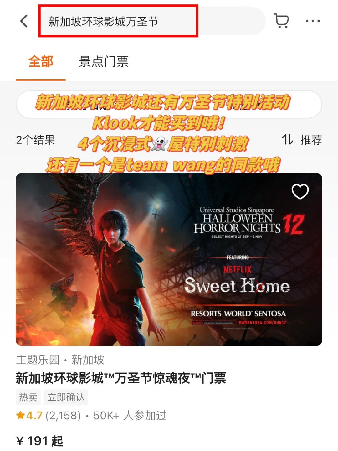 马上万圣节了,9.27开始新加坡环球影城有限定活动,有几个沉浸式👻屋特别刺激(其中有一个Team wang联名),Klook才能买到票哦!错过等一年!(图11)