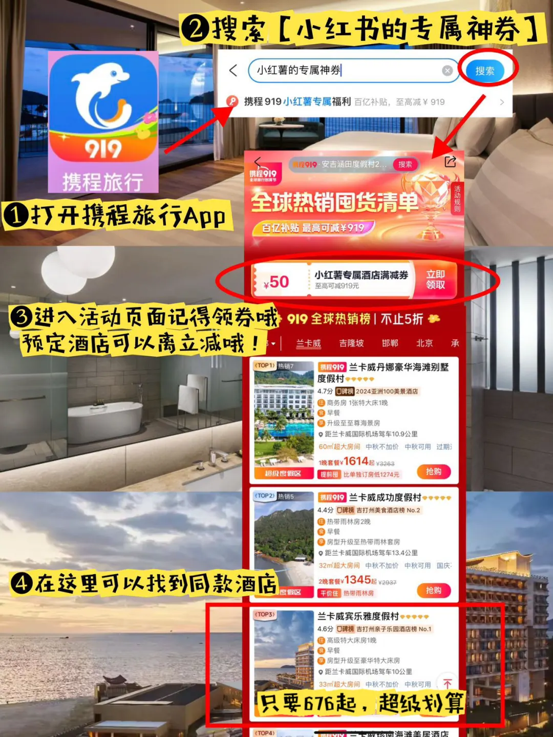 打开携程旅行App,输入【专属神券】就可以进入活动页面,先领取一张满599-50最高可减919的优惠券,再找到我入住的同款酒店!就可以提前囤房券啦~并且不去随时退,过期自动退