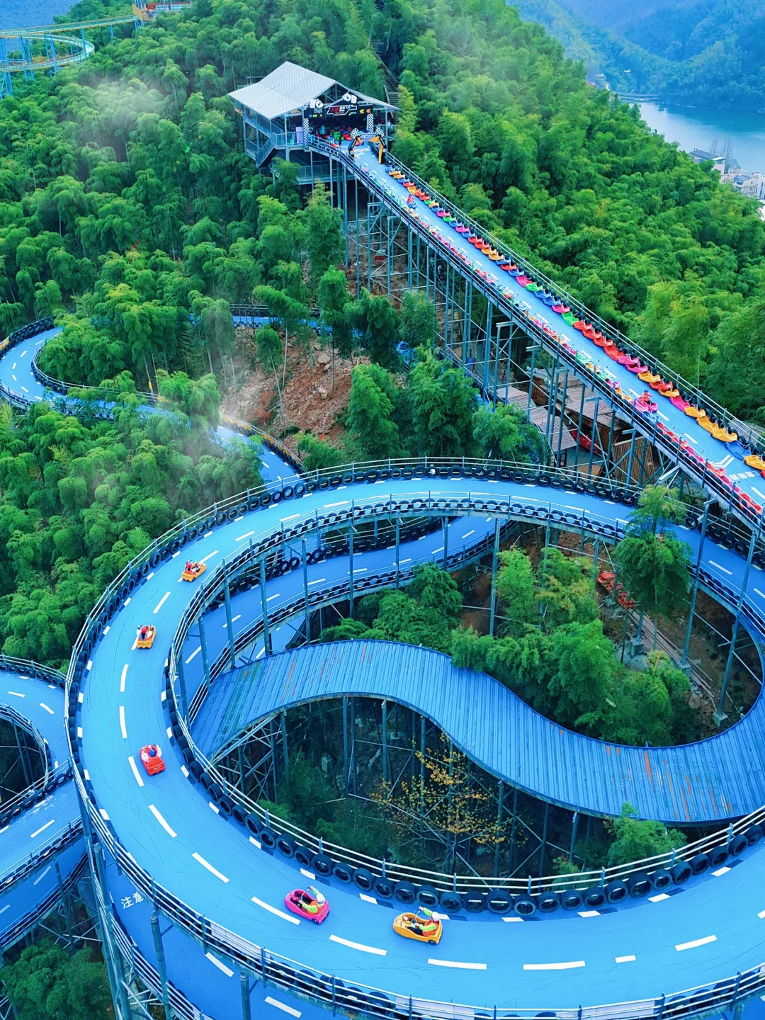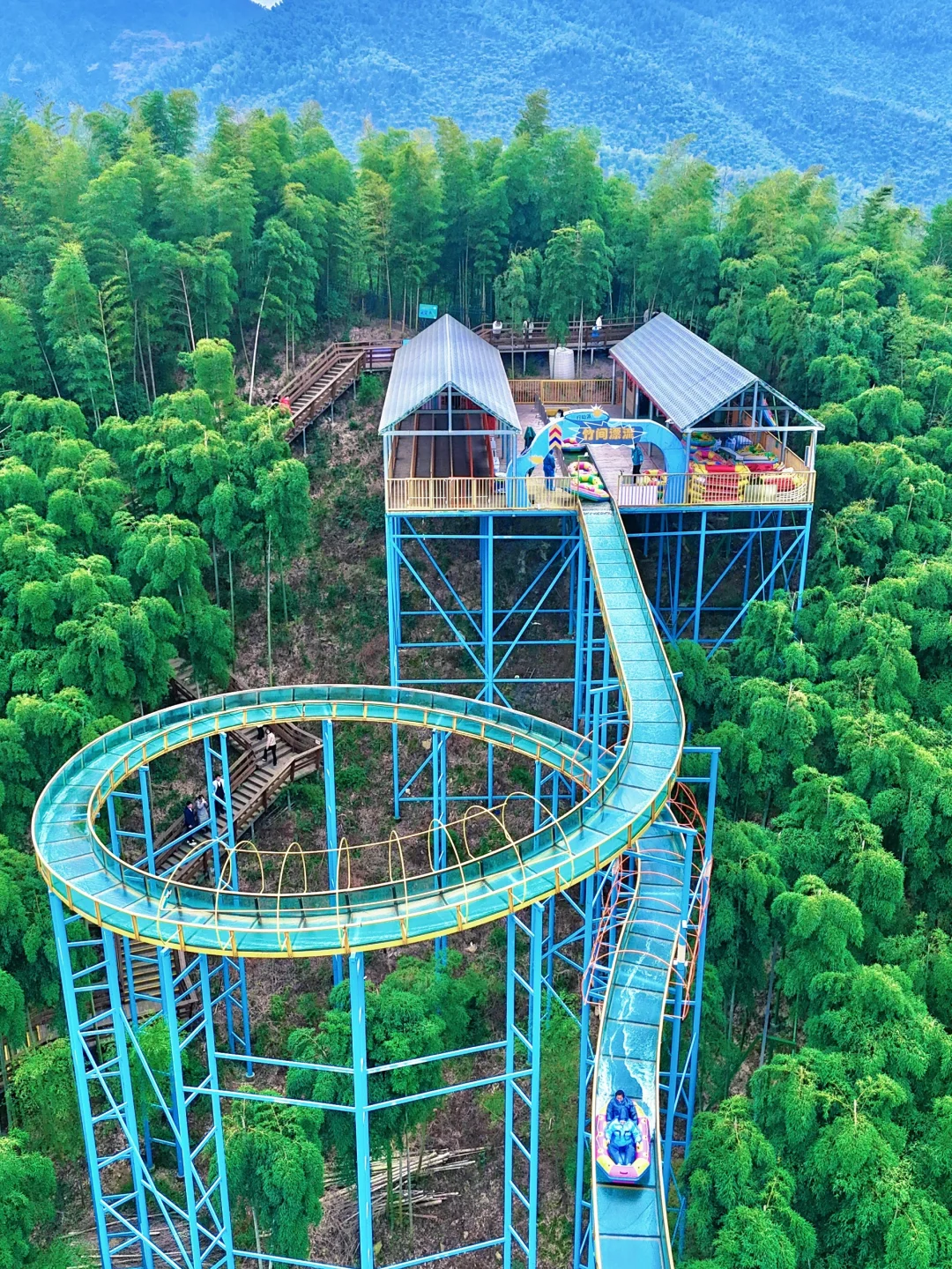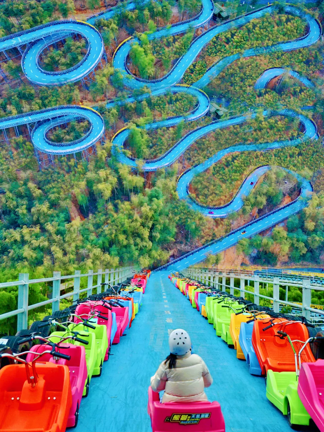✔️景区内可以骑着熊猫上山,老少皆宜,轻松不累!下山还可以选择天路飞车或竹海漂流,全程很刺激🤣