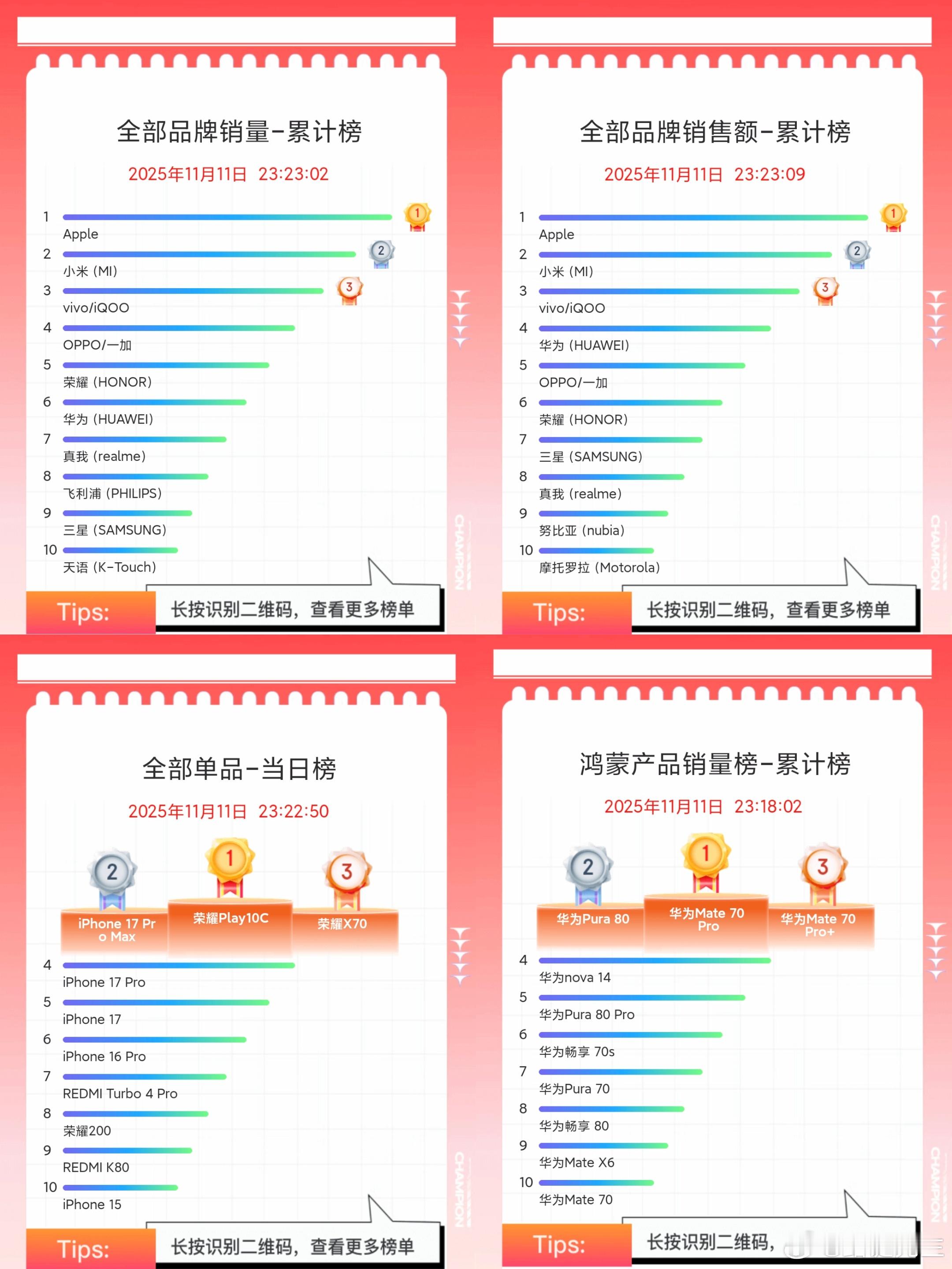 京东双11成绩单:总销量前三强:苹果、小米、vivo销售额前三强:苹果、小米、vivo最佳冲刺品牌:荣耀鸿蒙榜前三名:华为、华为、华为