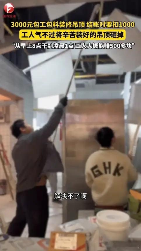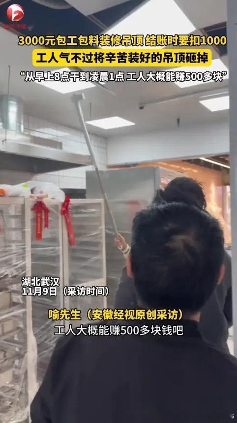 “太缺德了!”近日,湖北武汉,一老板找人做吊顶,谈好了3000元包工包料,工人从早上8点一直忙到凌晨1点才做完,可结账时,老板却说做的不合适,坚决要扣1000元,工人气不过,将装好的吊顶全拆了。网友:太欺负人了!武汉这装修团队太委屈了!连续干 17 小时熬到凌晨 1 点。结果吊顶刚装完,雇主一句话就要扣 1000 块,最后工人怒把吊顶拆了。带队的是喻先生(化名),他们四个工人接了个活,汉口某商铺的吊顶工程。之前跟店主口头说好,80 平方米包工包料,总共给 3000 块。喻先生说这价格在业内已经压得很低了。扣除 1800 块的材料成本,四个工人平分,每人也就拿 300 块工钱。11 月 9 号清晨 8 点,几个人带着工具材料准时到了现场。一开工就发现麻烦,原有房屋结构有偏差,得临时调整施工方案。为了赶工期不耽误事,他们连吃饭都没正经歇着。午饭晚饭都是轮流快速扒几口,接着又埋头干活,一直忙到第二天凌晨 1 点。四个大男人累得腰都直不起来,想着总算完工能结钱了。可店主过来一看,张嘴就说 “做工不符合预期”,非要扣 1000 块。喻先生赶紧跟店主商量,说哪里不满意可以返工修补。但店主态度特别强硬,要么接受扣钱,要么一分钱都别想拿。这 1000 块相当于啥?四个工人白干大半天,每人少拿 250 块。喻先生和工友们又气又急,协商了好几次都没结果。最后实在没办法,几个人咬咬牙,花了一个多小时。把刚刚装好的吊顶又全部拆了下来,不想让自己的血汗白搭。店主一看这情况,立马报了警,警方很快就到了现场。民警了解完事情的前因后果,明确跟店主说工程款可以按质量论价,但不能随便扣劳动报酬。最后在警方调解下,店主总算松了口。给了 2000 块基础材料费,相当于工人只拿回了材料钱,辛苦费还是没全拿到。这事传到网上,不少人都替工人抱不平。有网友说自己家装修时,工人也遇到过类似的恶意扣款,最后只能认栽。武汉市劳动监察支队有组数据,2023 年前三季度处理的装修劳务纠纷有 217 起。这里面超过六成,都是工人完工后被雇主恶意扣款,不是说这不好就是那不行。武汉做装修监理的朋友说,这行里口头协议太普遍了。很少有人签正式合同,连明确的验收标准都没有,很容易事后扯皮。不光武汉,其他地方也有不少这样的事。今年 8 月郑州有个木工团队,装完定制家具被雇主以 “细节不满意” 扣了 30% 工费。10 月份深圳还有个电工团队,完工后雇主直接拖着不给钱。最后没办法,只能走劳动仲裁才把报酬要回来,前前后后耗了快一个月。法律专家也说了,《保障农民工工资支付条例》里写得很清楚。用人单位得按合同约定及时足额给工资,要是恶意欠薪,最高能处欠薪金额一倍以下的罚款。工人拆吊顶看着冲动,其实也是没办法的办法。他们干的都是体力活,挣的每一分都是血汗钱,哪经得起这么坑。现在零工经济里,像装修工人这样的劳动者维权挺难的。没有规范的用工制度,纠纷调解也麻烦,这事真得好好想想办法解决。希望以后能有更明确的规则,让工人不用再担心白干活。毕竟凭手艺凭力气挣钱,就该拿到该得的报酬,别再让辛苦白费。