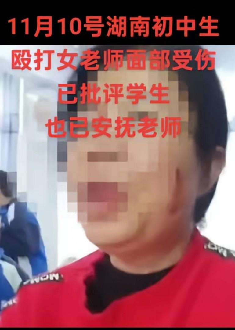 11月10日湖南初中生殴打女老师致面部受伤伤,处理结果: 已批评学生,已安抚老师! 学校会压老师让忍,息事宁人,请心理辅导给学生,向学生赔礼道歉!还好是学生打伤老师,而不是老师打伤学生。如果是老师打伤了学生,必然会舆论汹汹,立马被开除公职。