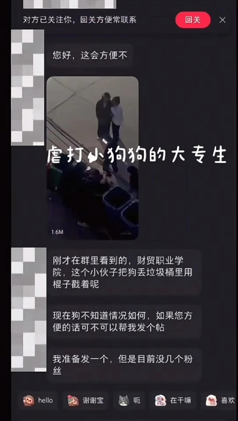 11月10日,网曝甘肃省财贸职业学院兰州校区,一名学生把流浪狗扔进垃圾桶里,并且用棍子不停的殴打…… 目前有爱心人士已经去到学校将狗狗领养,学校也承诺会处分虐狗学生。从领养狗狗的博主晒出的图片可以得知,还是有非常多的爱心人士愿意奉献出他们的绵薄之力来帮到狗狗的! 而据网友称:这不是大专院区,而是一个中专院区,打狗的男生是一个中专生。读书不行,人品也不行的那种!
