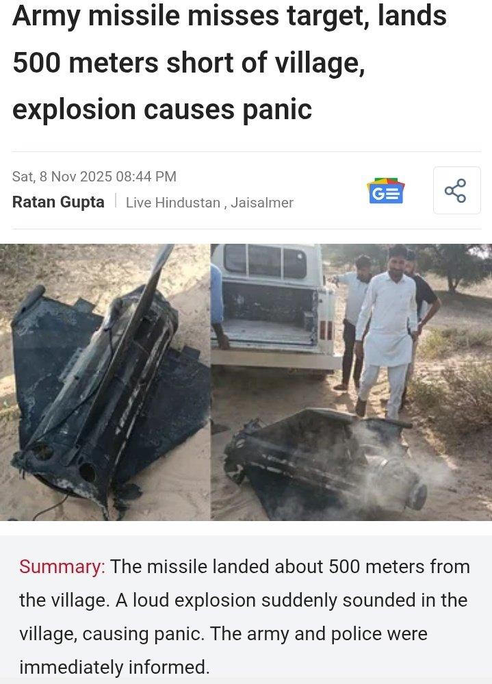 被印度吹的神乎其神的国产“阿卡什””防空系统又闯祸了。 当地时间11月8日,印度"阿卡什"导弹在演习测试中发生故障,并在拉贾斯坦邦巴迪亚当地平民区附近500米处坠毁,爆炸巨响引发当地人一片恐慌。 要知道这个在此前印巴冲突中(辛多尔行动),被印度军方大吹特吹的“阿卡什”,在冲突结束后,就被巴西取消了订单,即使这样,印度方面一再向其他国家吹嘘其系统有多么先进,想要以此打开国际军售市场,如今又闹笑话,靶机没打到,差点把自己人送走,这哪是保卫其国家的防空系统?分明是一个具有明显“布朗弹道”的杀手啊!