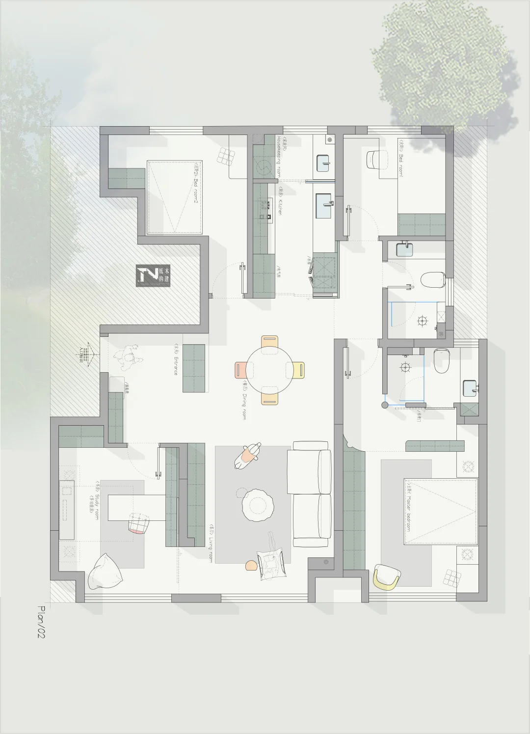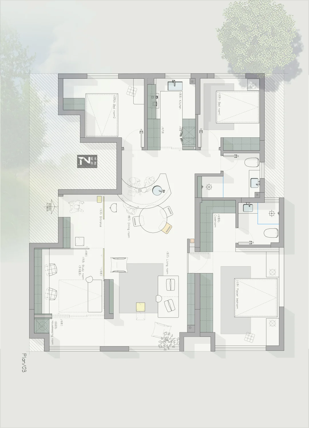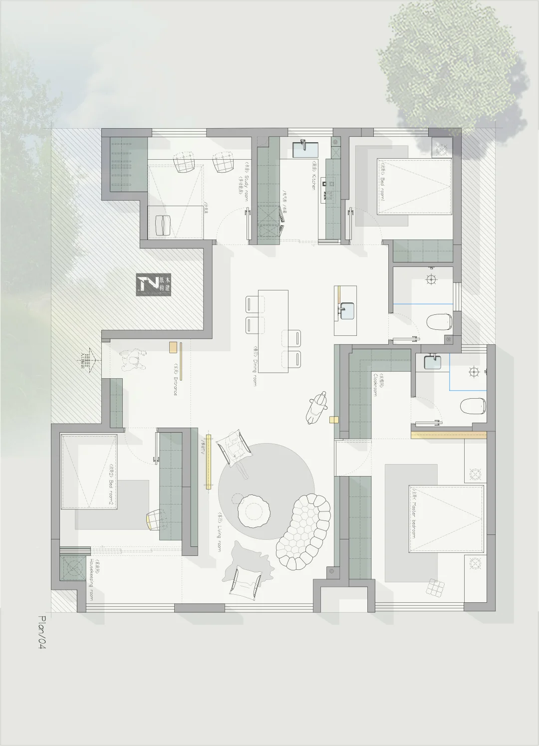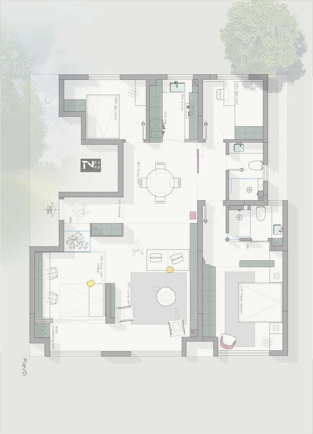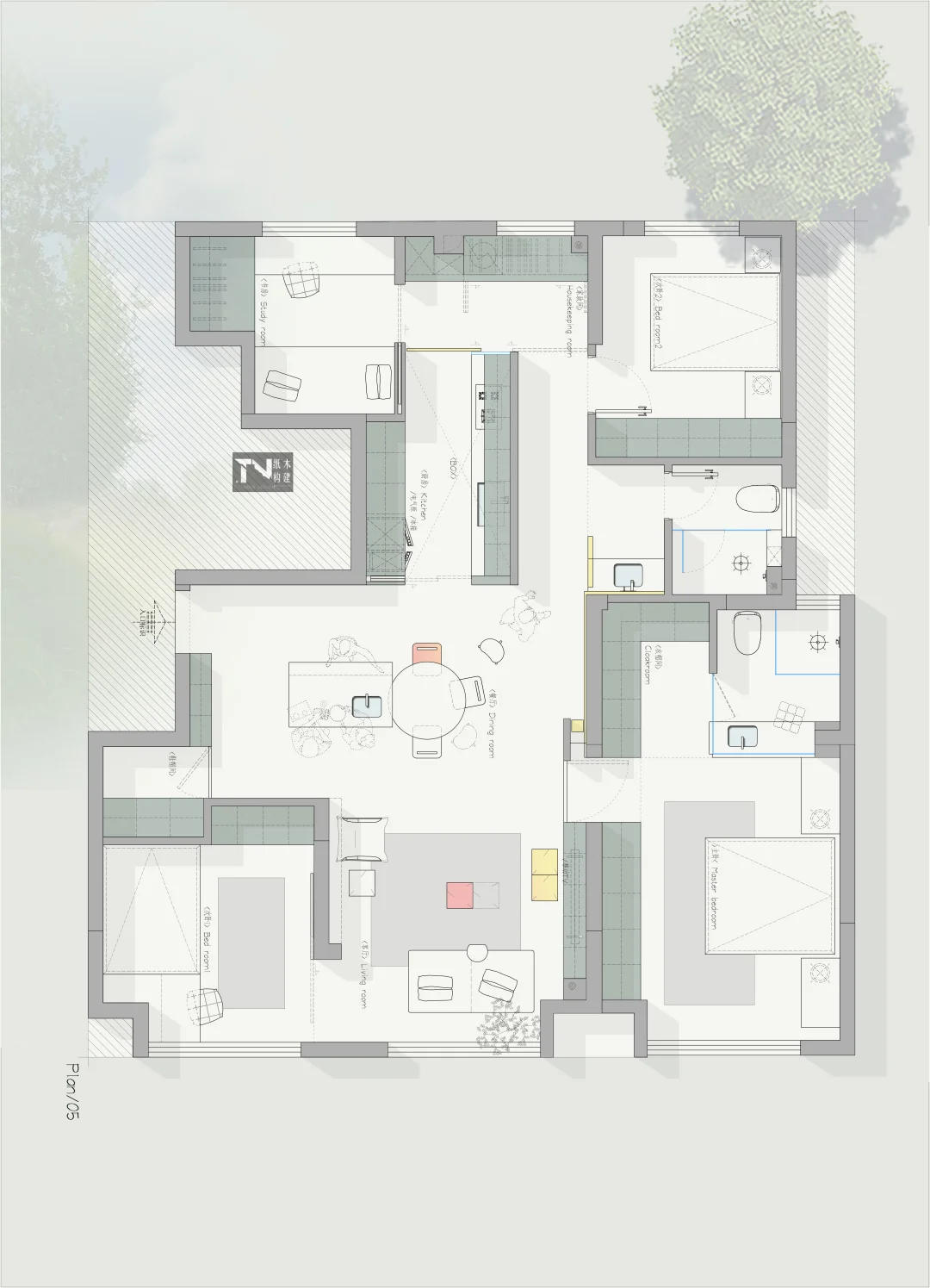 一个户型五版方案 设计需求: 1、两个孩子房 2、主卧最好有衣帽间 3、尽可能有家政间,实在没有放阳台 4、一个多功能书房兼临时客房 最后想多看几个方案